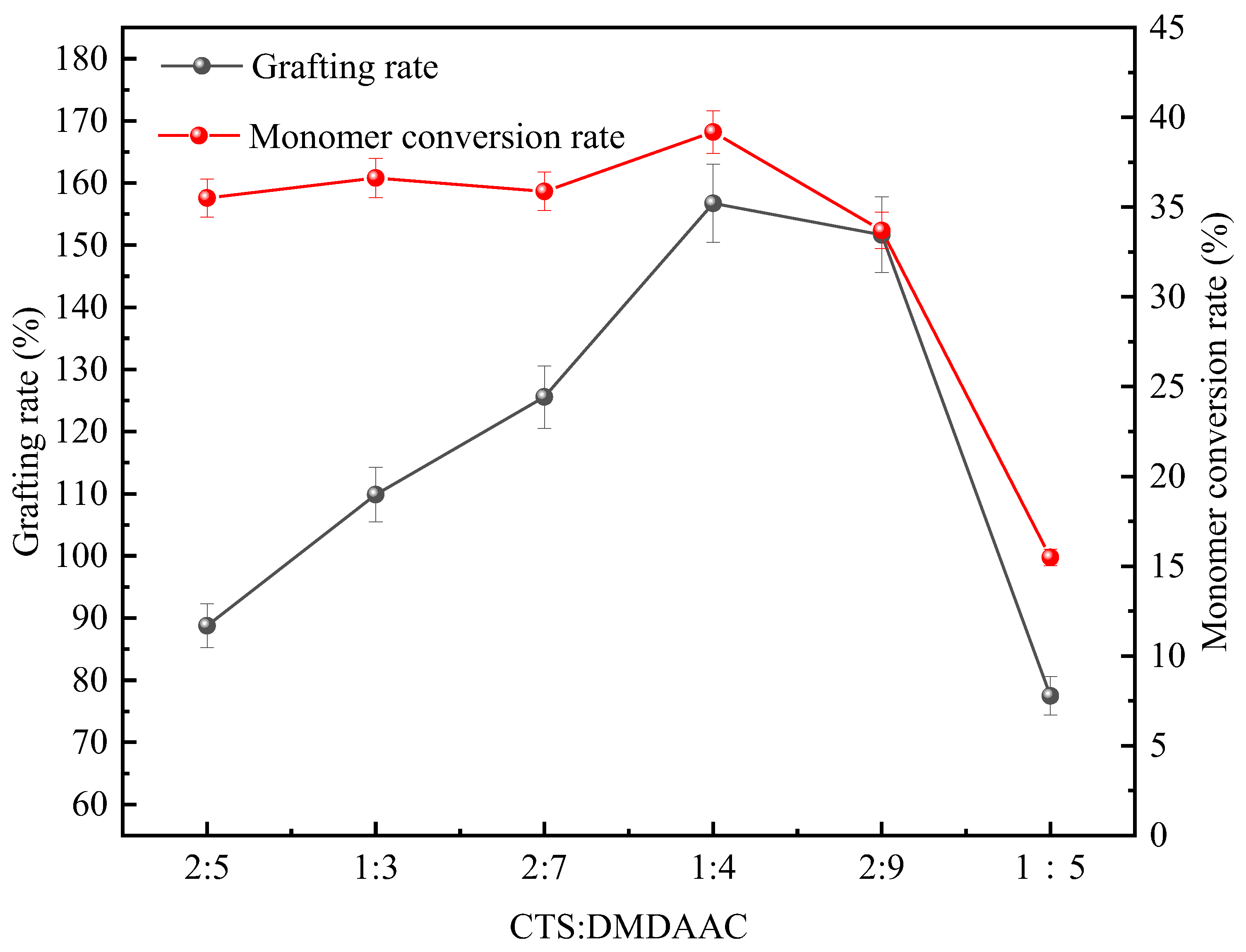 The mass ratio of CTS (the main chain in the grafting reaction) to DMDAAC can directly affect the number of grafted monomers that each active site can receive, which impacts the grafting rate of the product and the conversion rate of DMDAAC. Meanwhile, if the proportion of CTS in the product is too high, this will reduce the solubility of the grafted product [