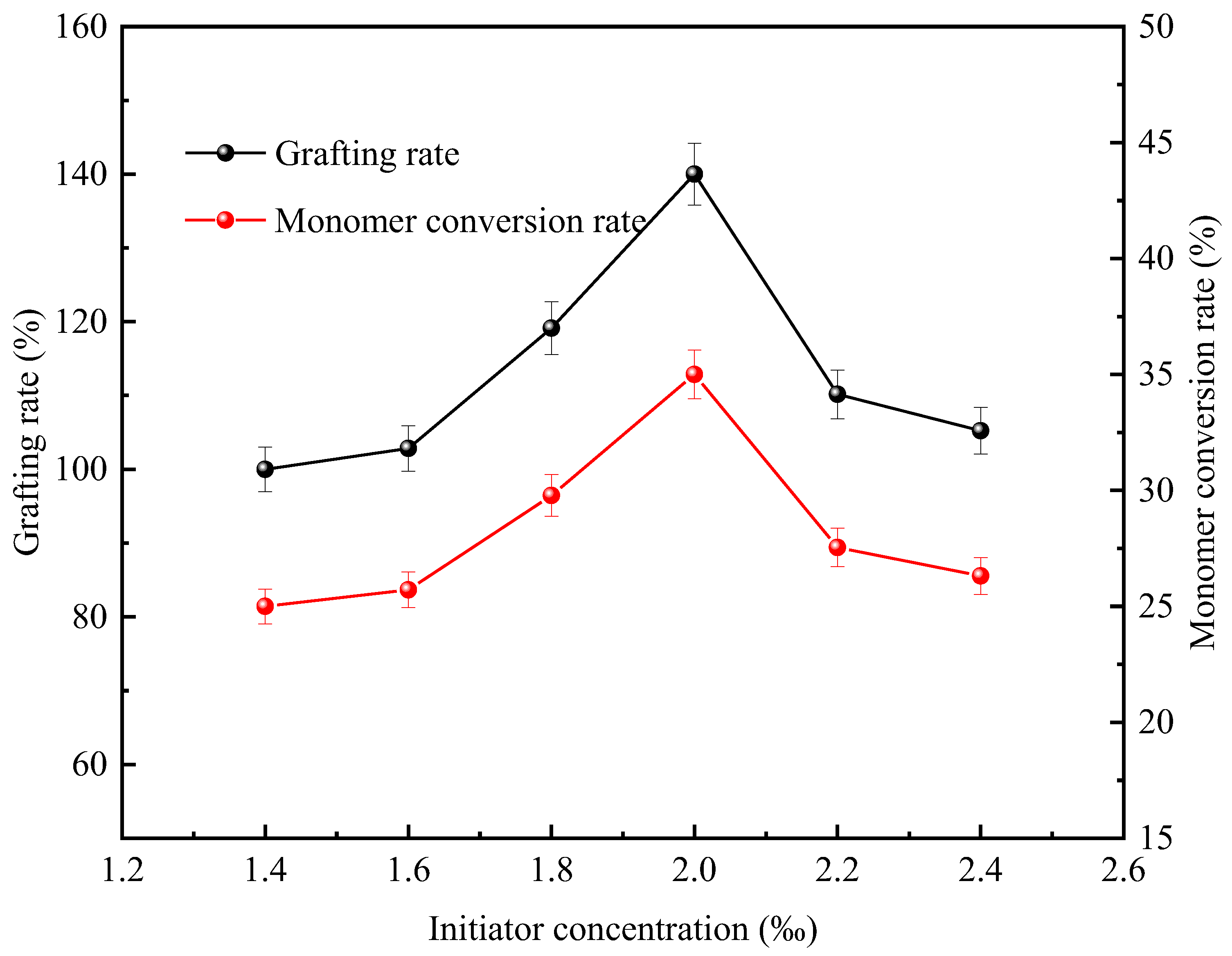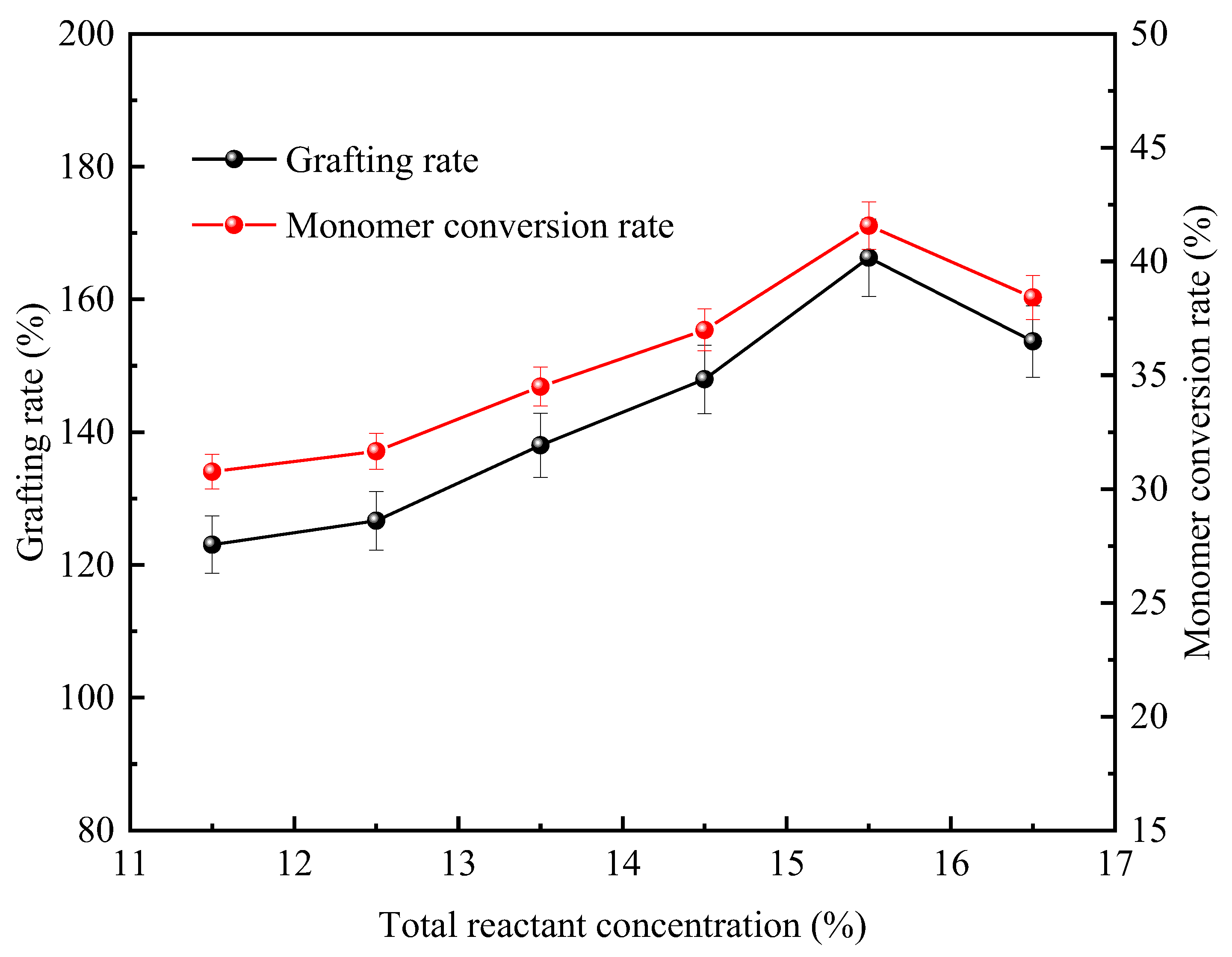 14]. The above factors jointly inhibit the reaction process, reduce the reaction degree of the graft polymerization reaction, and result in a decrease in the grafting rate and monomer conversion efficiency. To sum up, the experiment shows that the optimal total concentration of the reaction system is 15.5%.