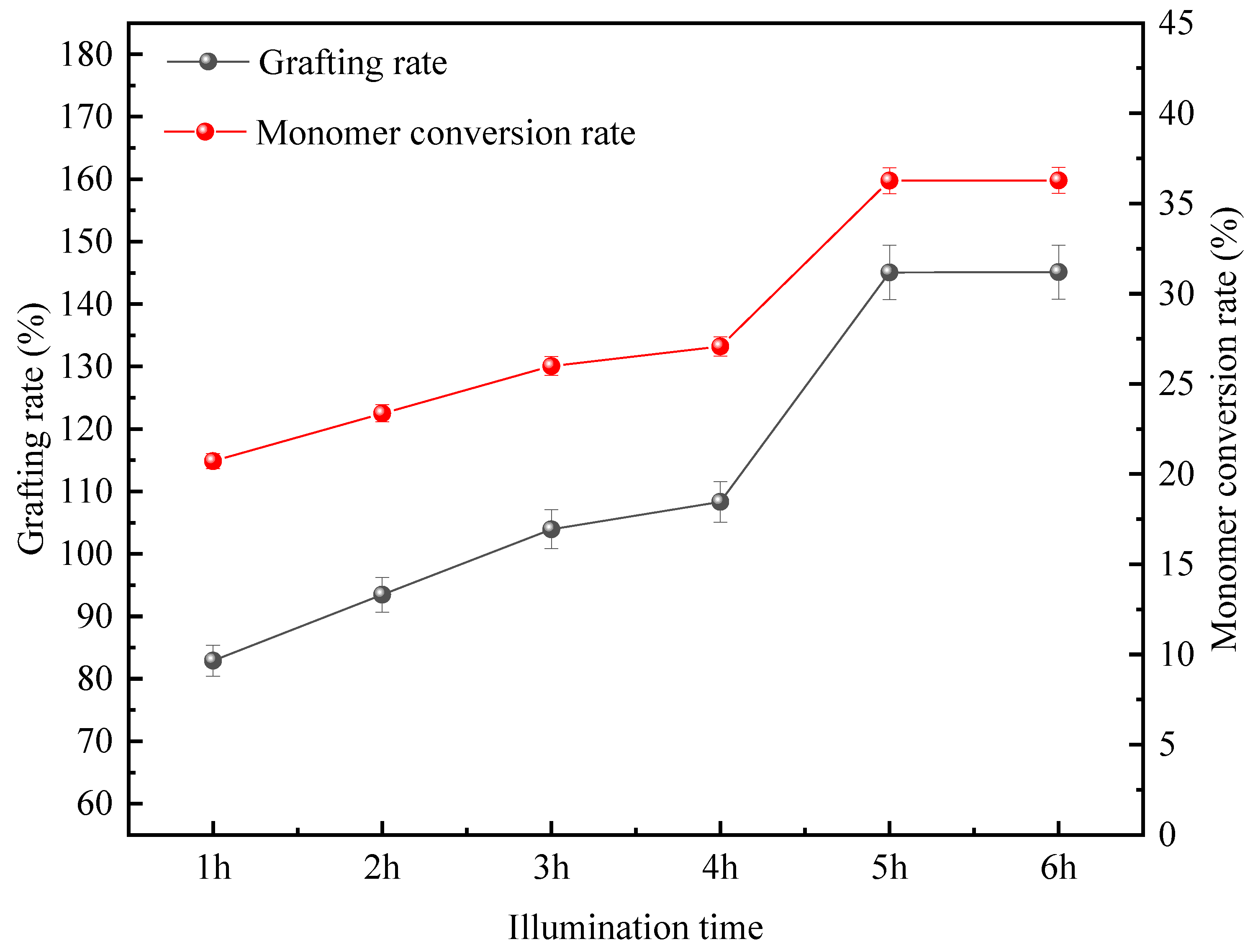 The experimental results show that when the light exposure duration increases from 1 h to 5 h, the grafting rate of the product and the rate of DMDAAC conversion show a significant upward trend, reaching 145.05% and 36.26%, respectively, with 5 h of light exposure. After more than 5 h, both enter a growth plateau period, indicating that the photoinitiated polymerization reaction reaches equilibrium at this stage.