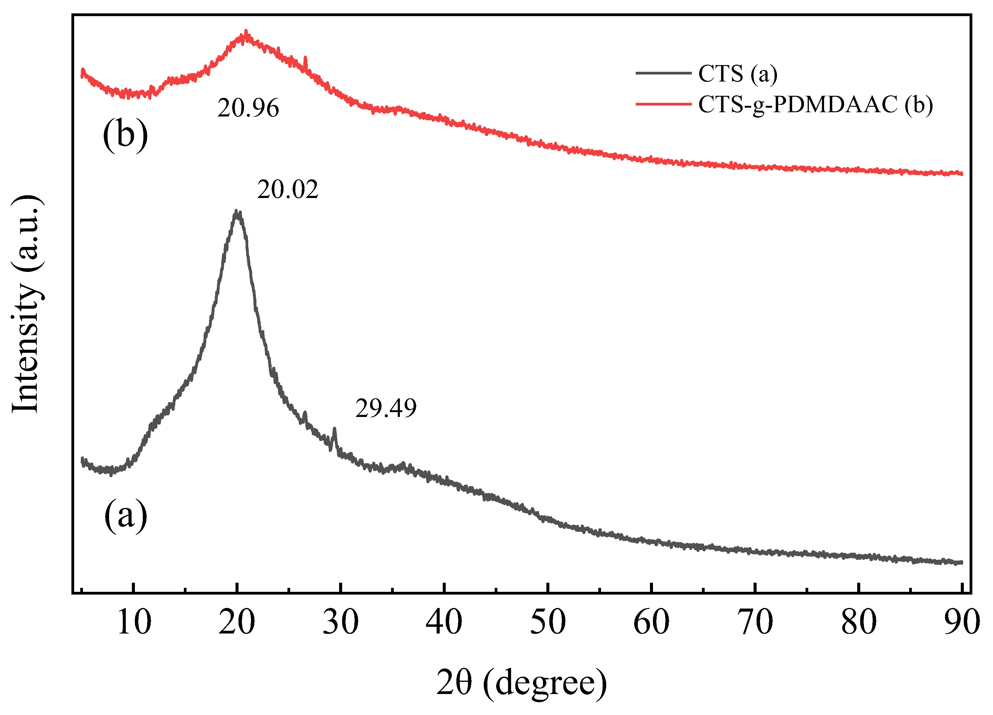 The differences in the crystal structures of CTS and CTS-g-PDMDAAC can be clearly observed through XRD diffraction spectroscopy characterization. As shown in