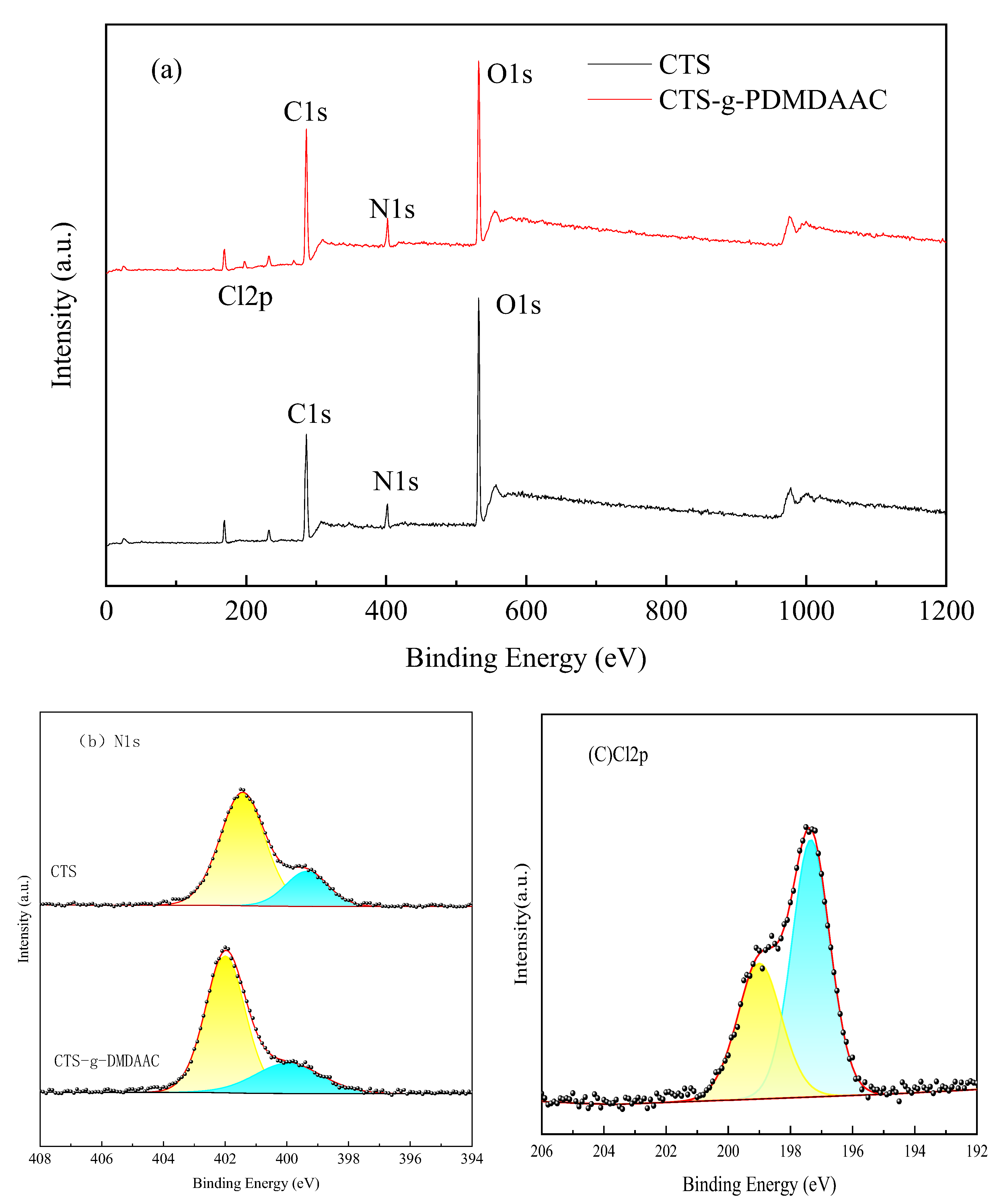 XPS spectra of CTS and CTS-g-PDMDAAC (a), N1s (b), and Cl2p (c).