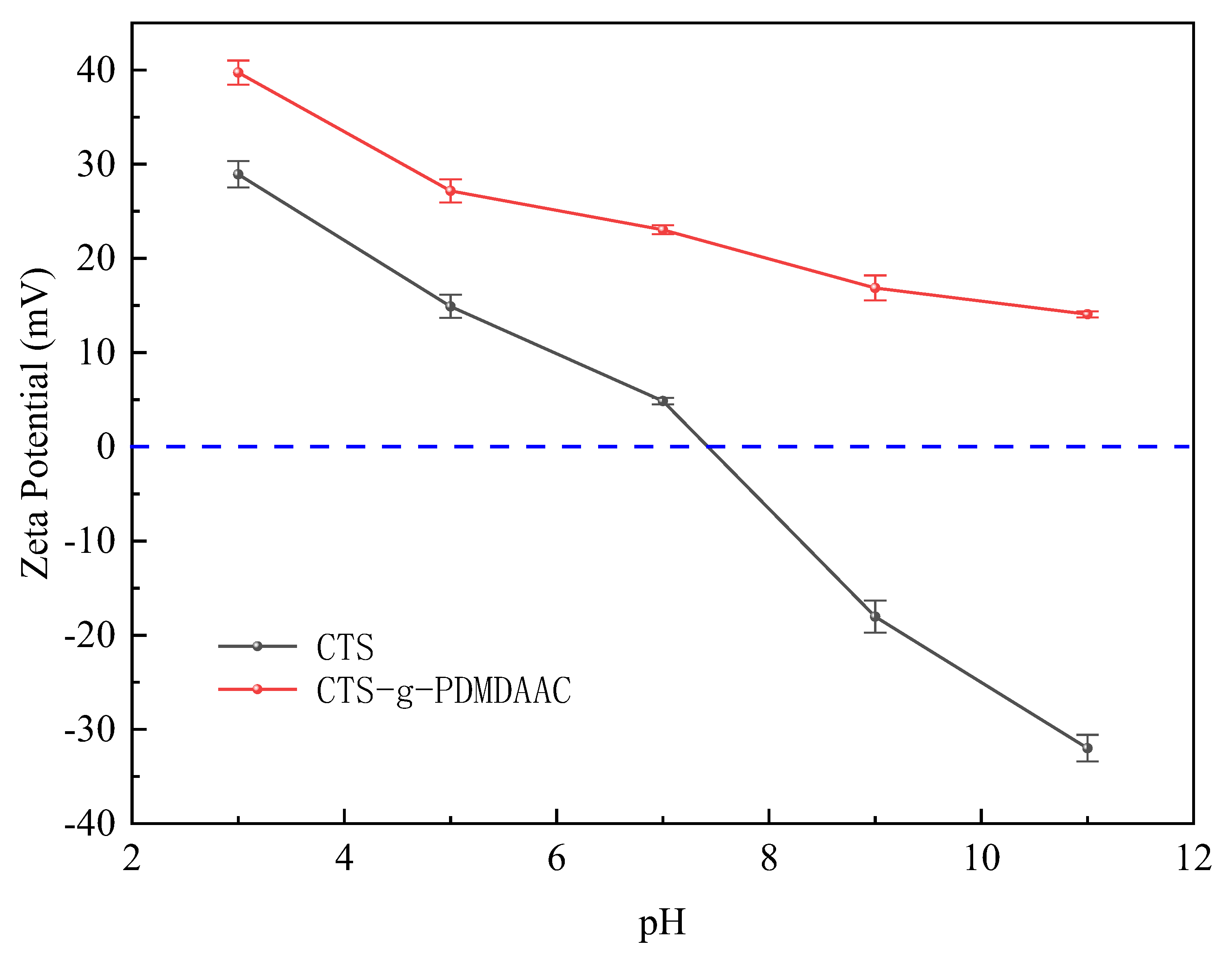 Variation in Zeta potential of CTS and CTS-g-PDMDAAC with pH.