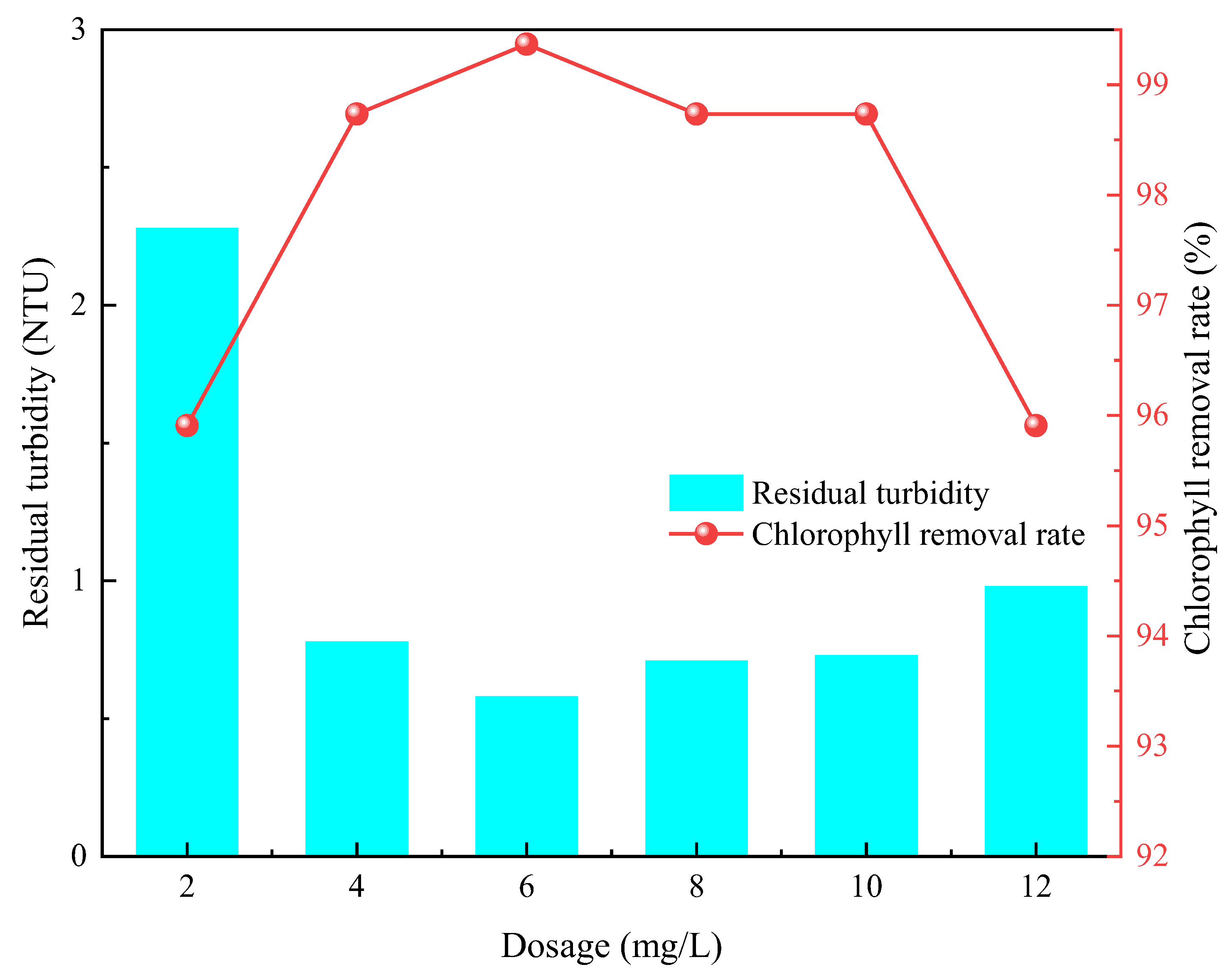 The kaolin was measured and dissolved in water. Then, the original algal solution was added in several portions to adjust the initial turbidity to 20.00–25.00 NTU and the chlorophyll a concentration to 0.5–1.0 mg/L. The flocculant was added and the coagulation was carried out by using a six-in-one stirring system according to its preset parameters. The settling time was 30 min. After static sedimentation, the residual turbidity of the supernatant and the concentration of chlorophyll a were measured to evaluate the flocculation effect.