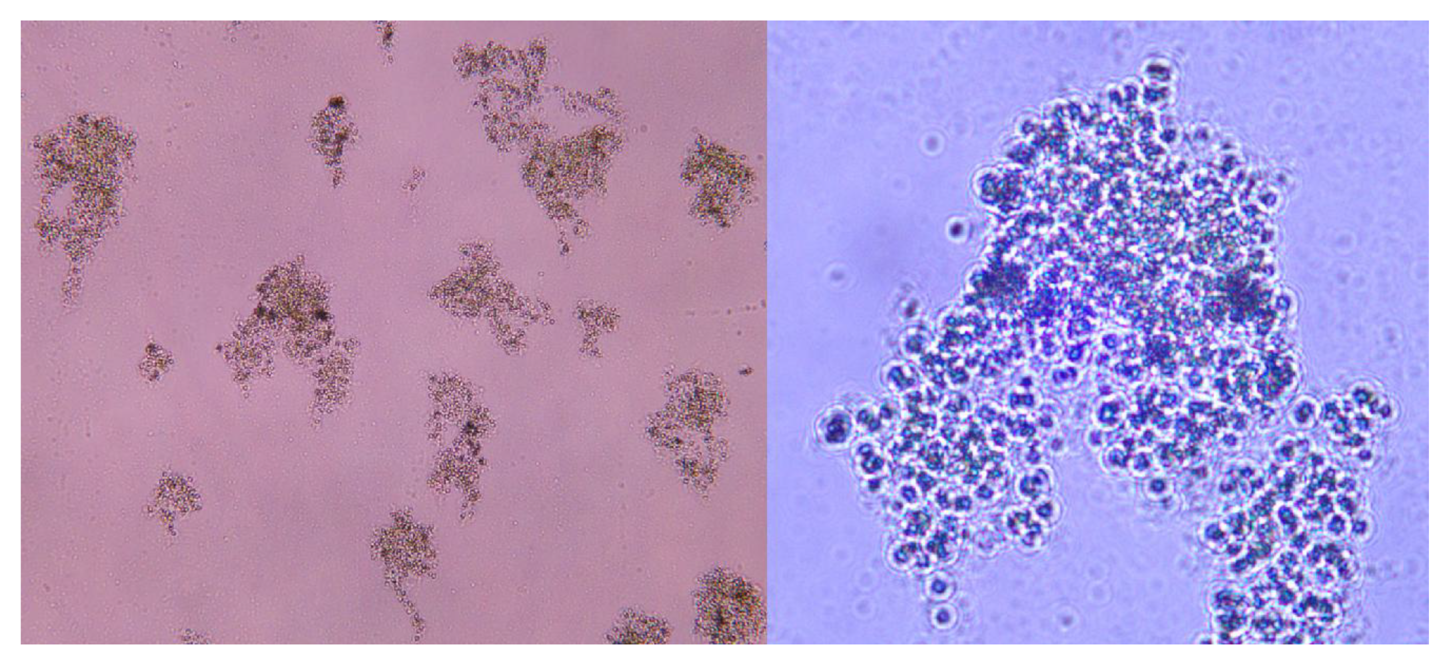 Optical micrograph of Chlorella flocs formed by CTS-g-PDMDAAC: (left) multiple flocs at low magnification (×100); (Right) Detailed morphology of a single floc, displaying complete algal cells (×400).