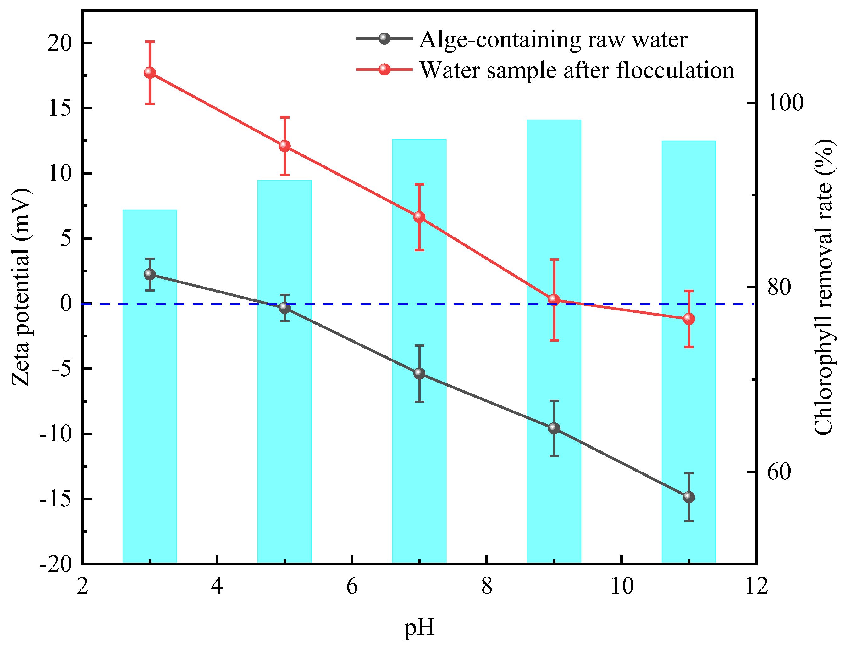 The relationship between the Zeta potential of the supernatant after CTS-g-PDMDAAC flocculation and the rate of chlorophyll-a removal at different pH values.