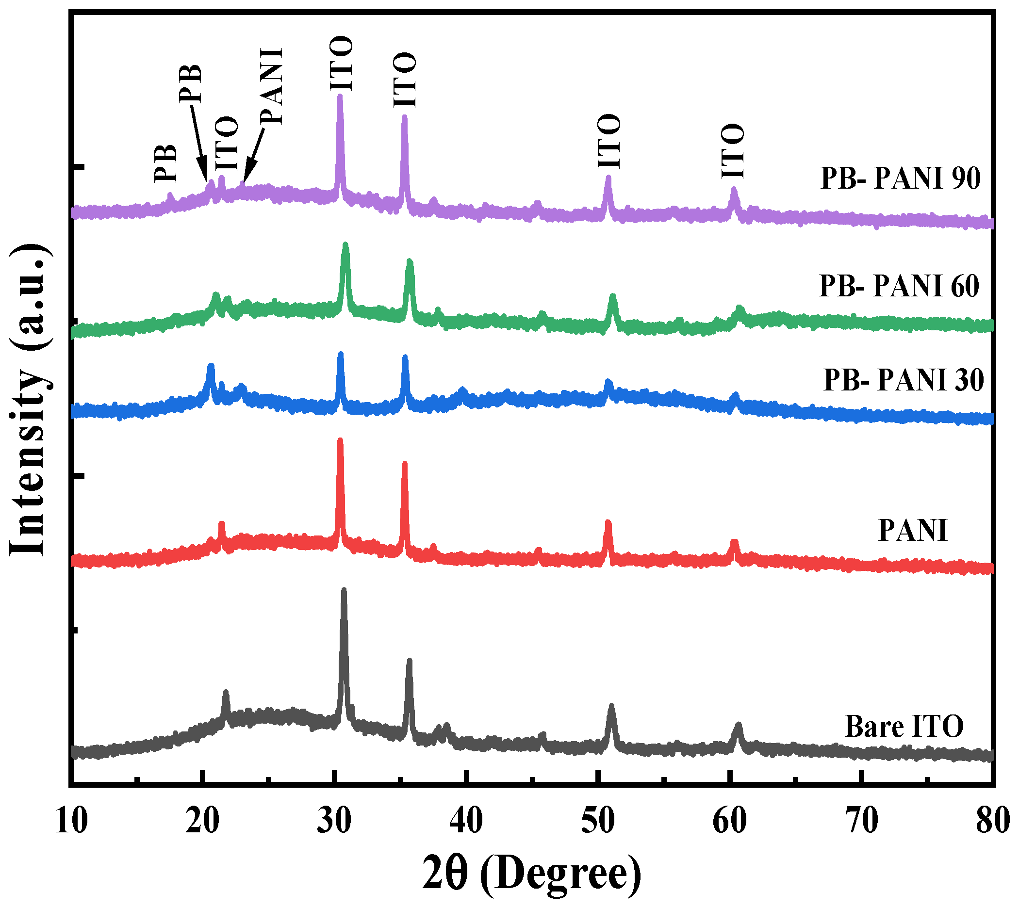 22]. Thus, from the XRD studies, we confirmed the presence of both PB and PANI in the composite electrode.