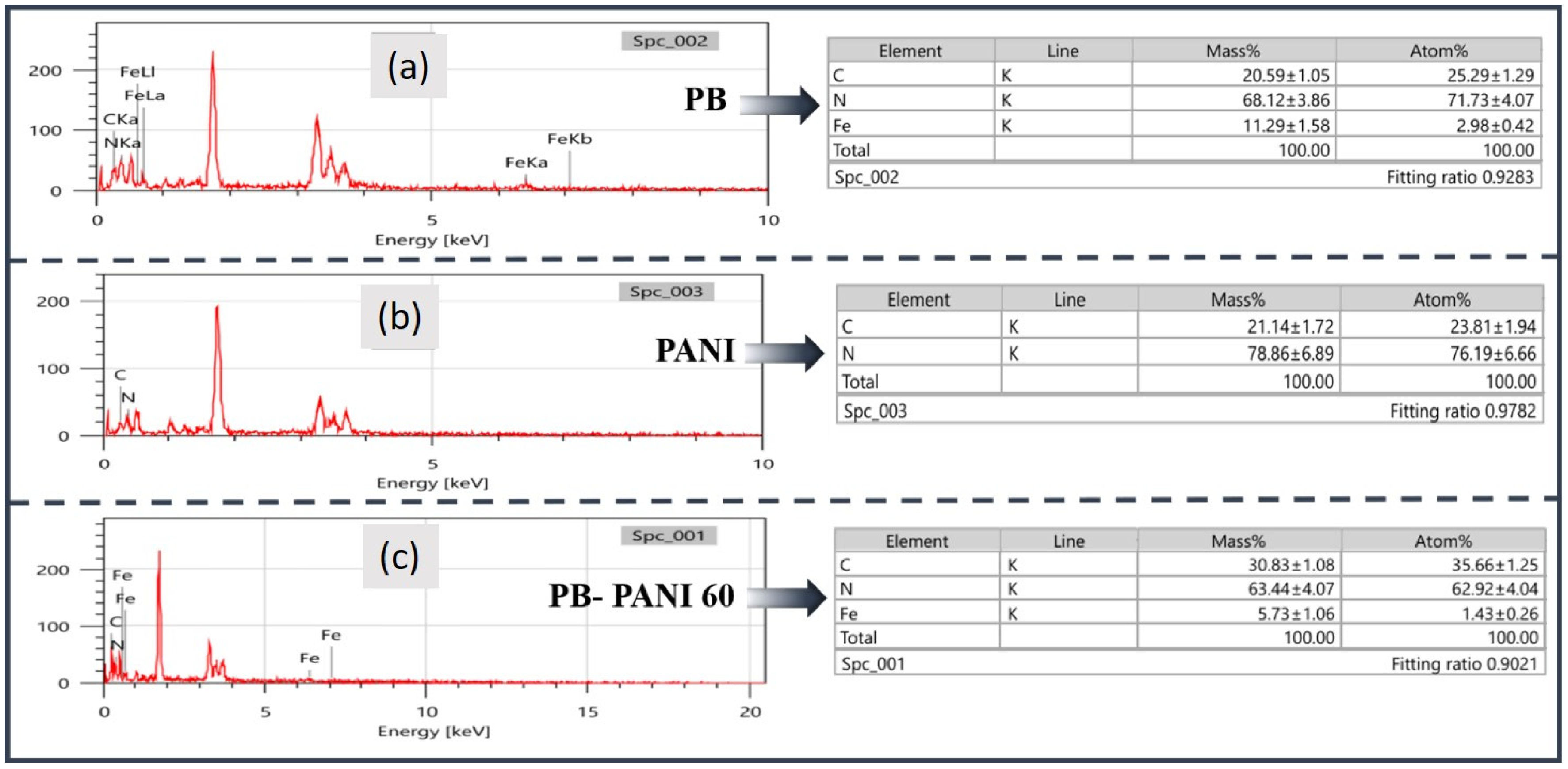 Figure 3a presents the EDS spectra of the PB sample with Fe, C and N elements;