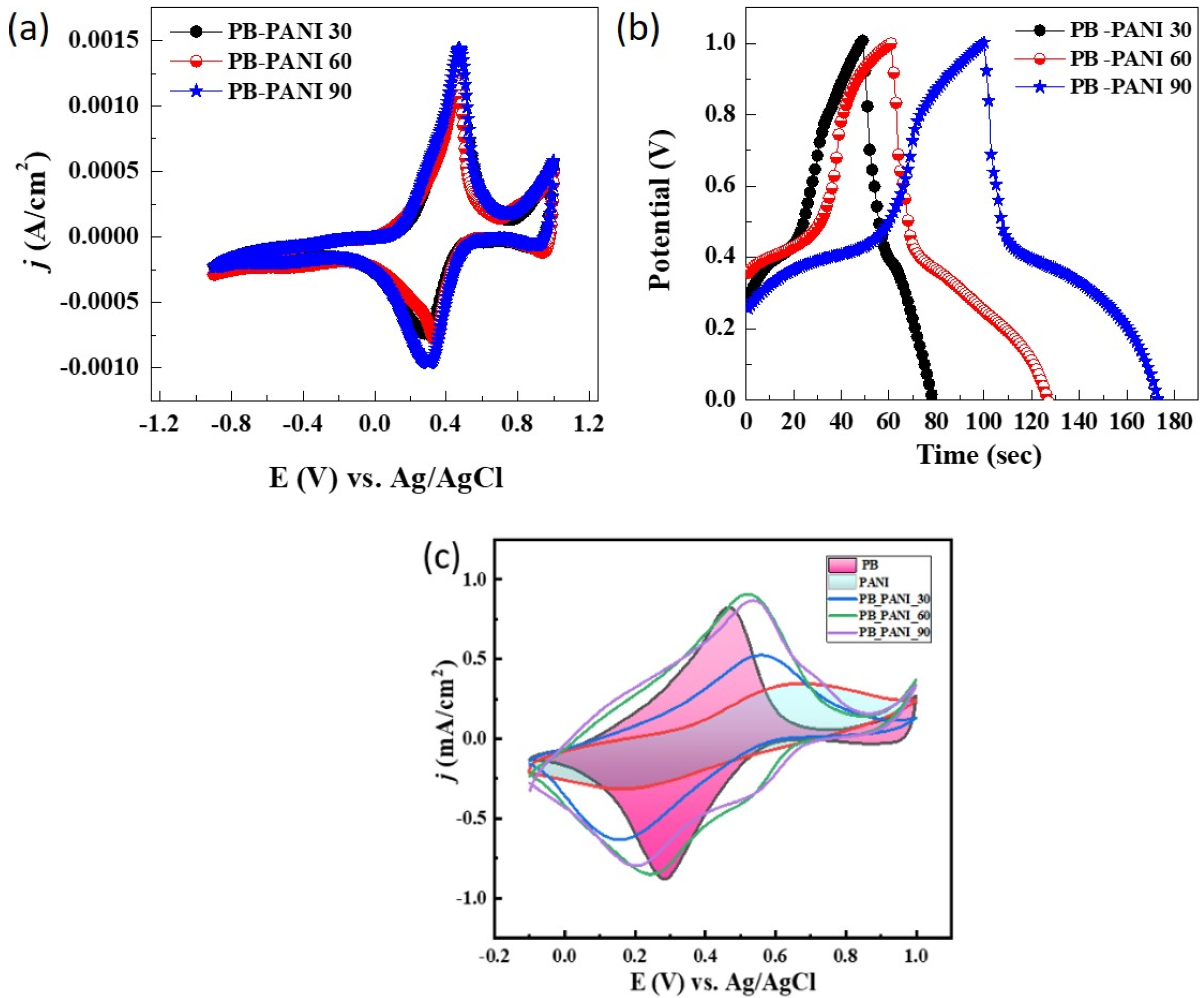 Figure 4b illustrates an overlay of the GCD curves for all three PB-PANI electrodes recorded at a current density of 0.1 mA/cm
