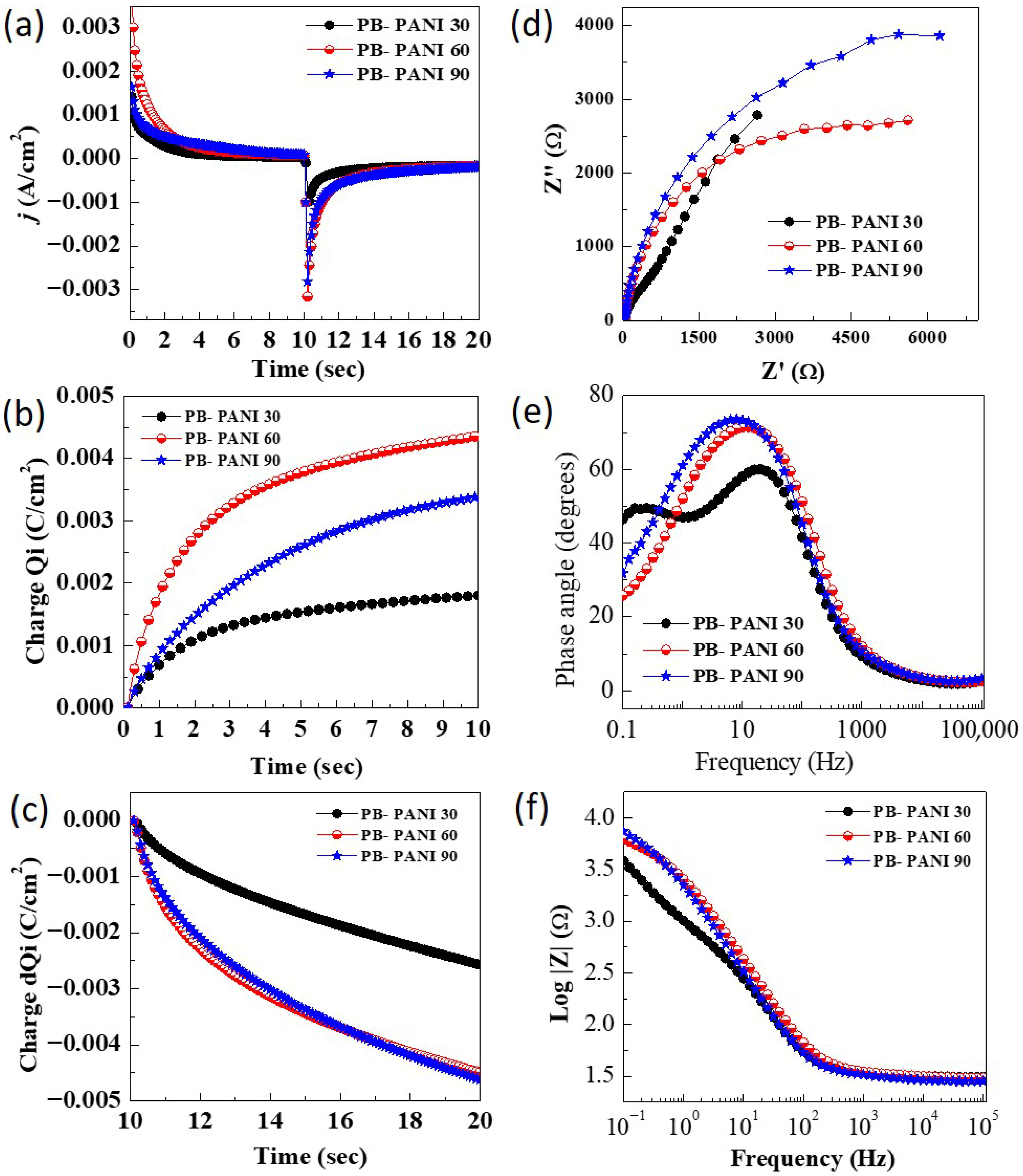 Figure 5e. The obtained values of the phase angle for composites PB-PANI 30, PB-PANI 60 and PB-PANI 90 are −73.49°, −71.41° and −60.01°, respectively. The value of the phase angle displays processes involved in the charge storage as 0° for resistive, −90° for capacitive and −45° for the diffusion type of charge storage [
