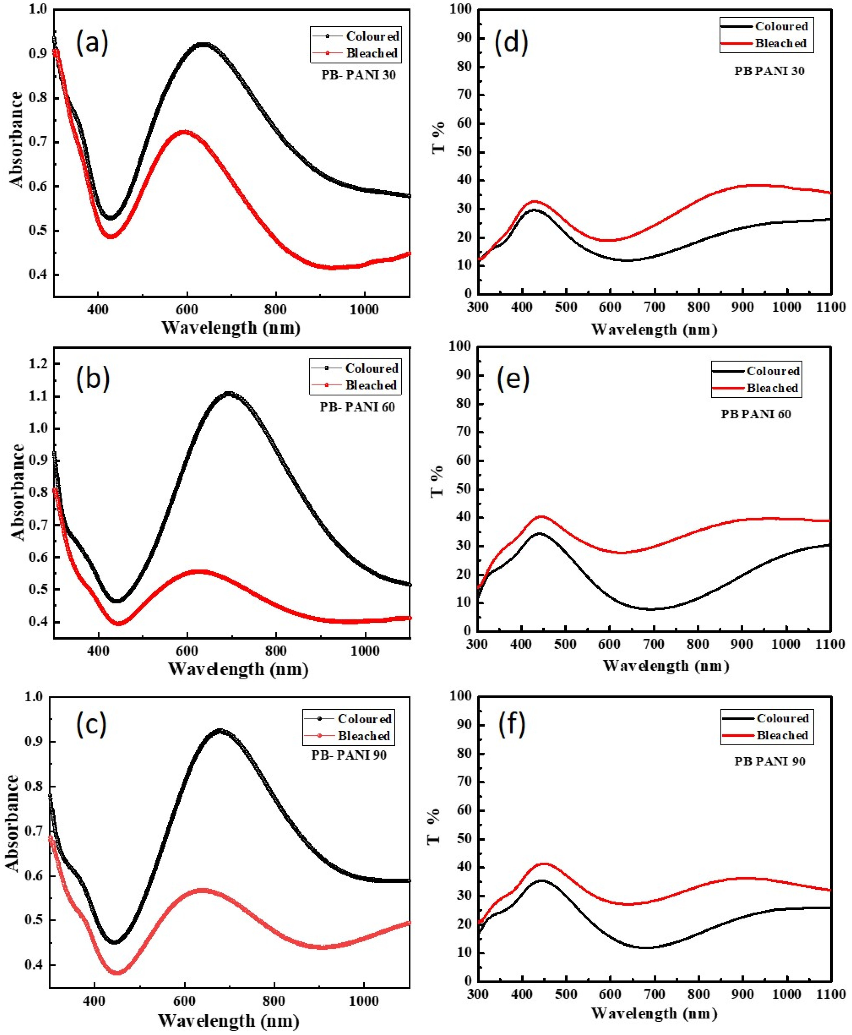 Figure 7 shows digital photo images of colored and bleached states of PB-PANI 30, PB-PANI 60, and PB-PANI 90. The results indicate that increasing the reaction time leads to greater optical modulation as more material is deposited over time, forming a thicker layer. A thicker film allows for a more intense coloration in the colored state, enhancing the contrast between the bleached and deep-blue states. The results of optical studies are shown in