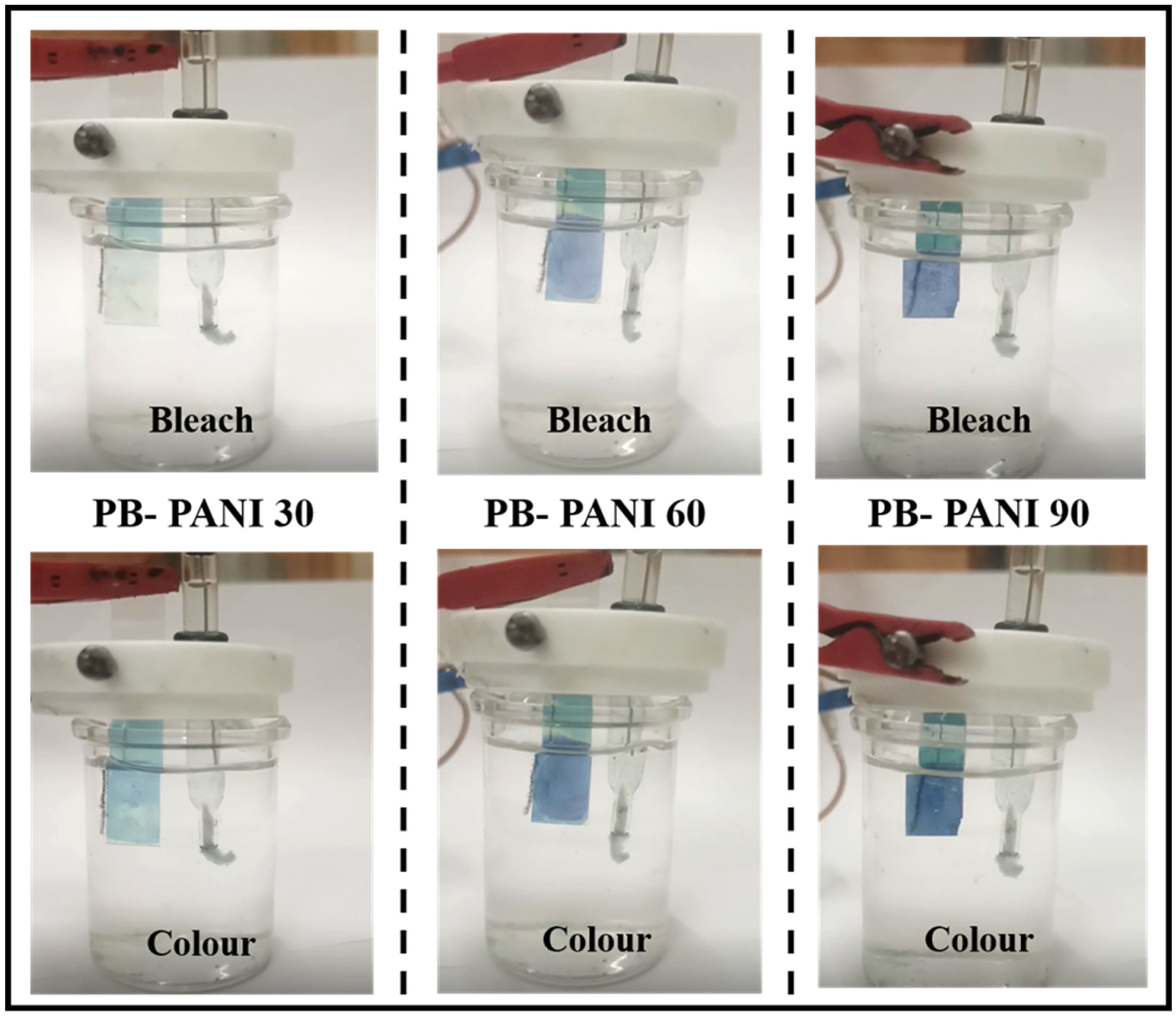 Figure 4a) are performed using a three-electrode electrochemical setup in a 1 M KCl electrolyte, with the applied voltage ranging from −0.9 to 1 V at a scan rate of 25 mV/s. The KCl electrolyte was chosen primarily for the stability of the Prussian blue (PB) film, which is degrades in strongly acidic environments. In this PB–PANI composite, PB acts as the primary electrochromic center, while PANI serves largely as a conductive, ion-permeable matrix, along with a safeguarding PB layer. This matrix helps electron transport and stabilizes charge compensation during the intercalation and deintercalation of K