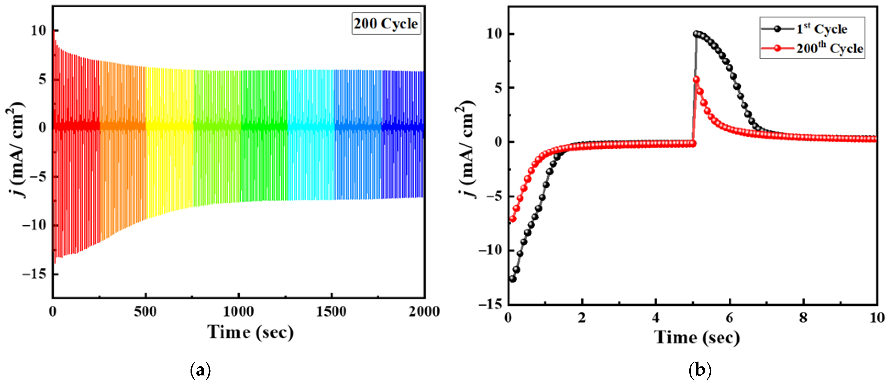 Figure 8a shows the electrochromic stability of the composite electrode over 2000 consecutive chronoamperometric cycles with 2000 s of working time, and