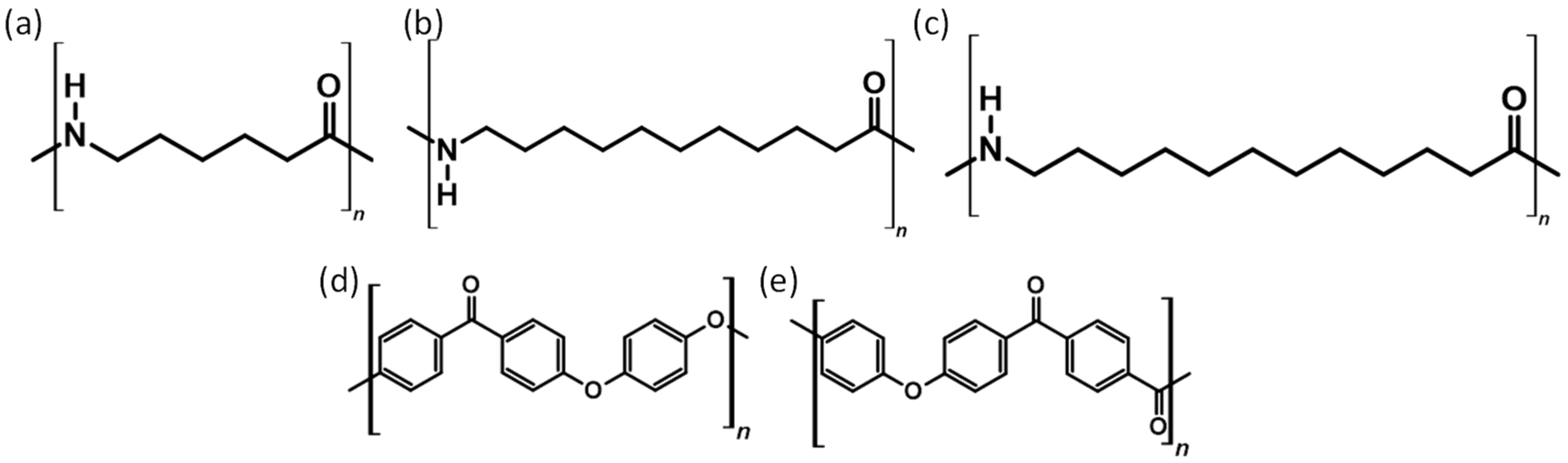- Sterner, E.S. Three Ways to Polyamides: The Impact of Polymerization Mechanism on Polymer Properties. J. Chem. Educ. 2019, 96, 2003–2008. [Google Scholar] [CrossRef]