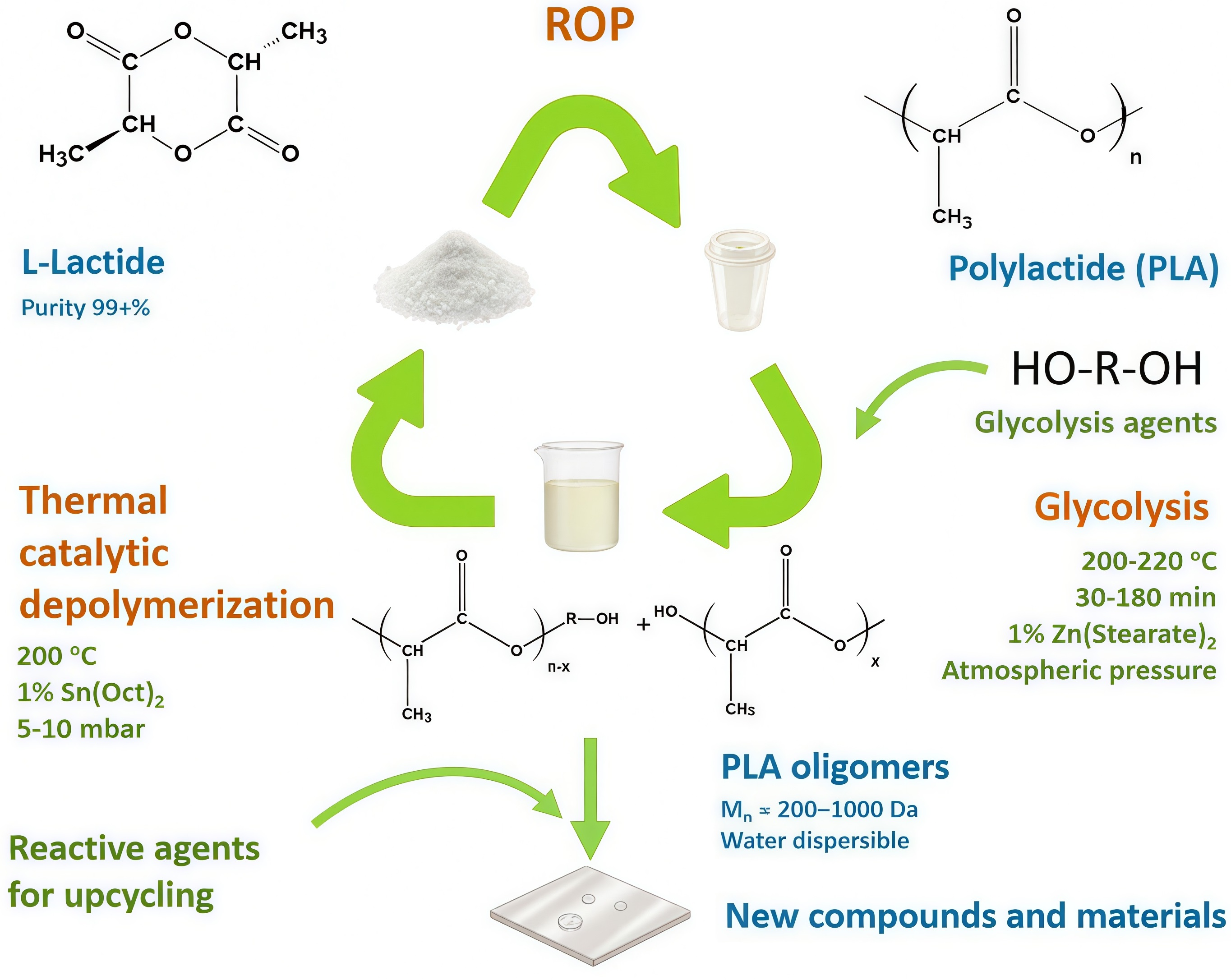 - Compared with hydrolysis, which primarily yields lactic acid, and pyrolysis, which typically requires 260–350 °C, our results show that glycolysis offers a complementary, lower-temperature route that directly furnishes lactide-compatible, water-miscible oligomers and thus simplifies both cleaning and closed-loop recycling schemes.