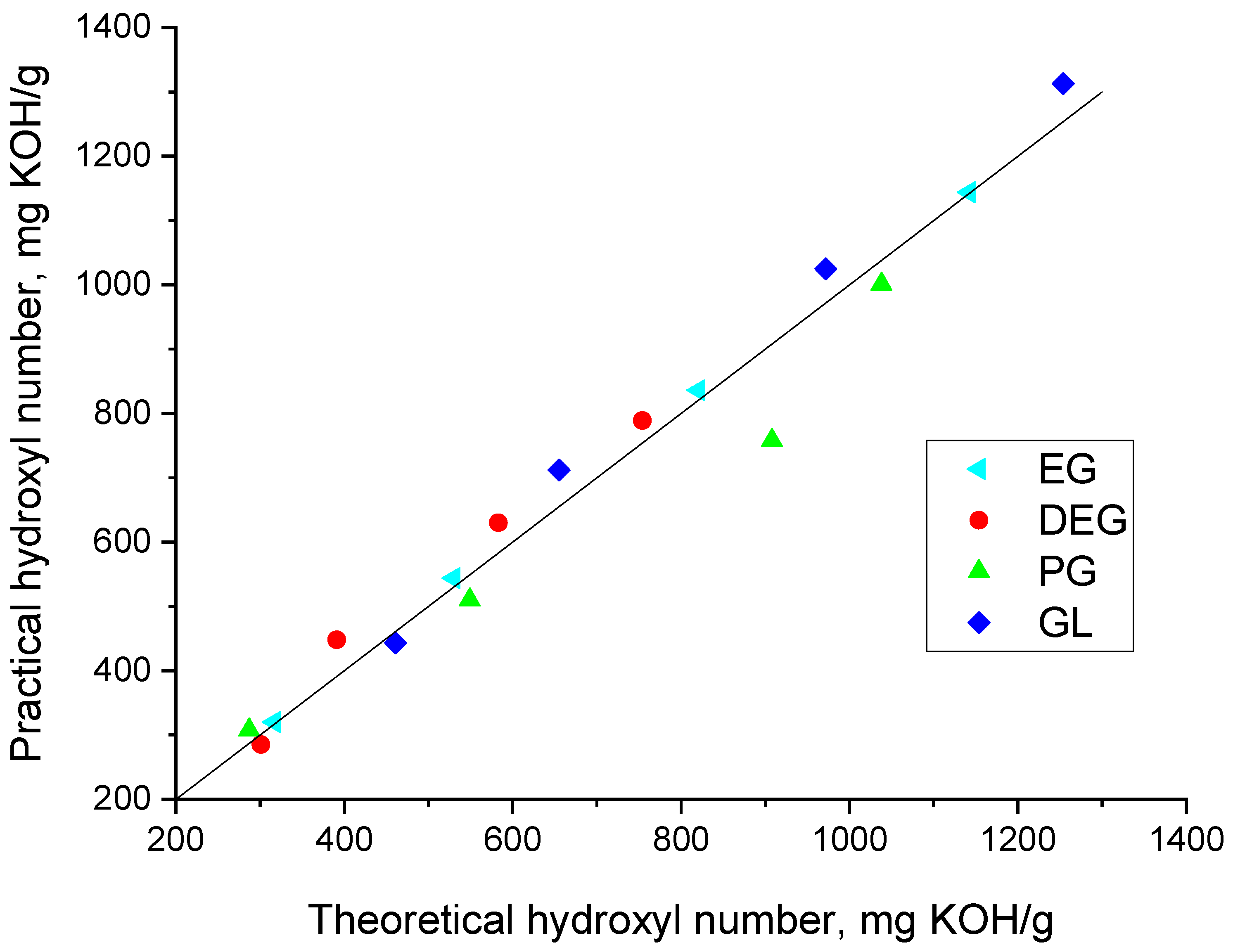 | № | Glycolysis Agent | PLA:GA Ratio | Hydroxyl Value, mgKOH/g | Theoretical Hydroxyl Value, mgKOH/g | Mn, Da |