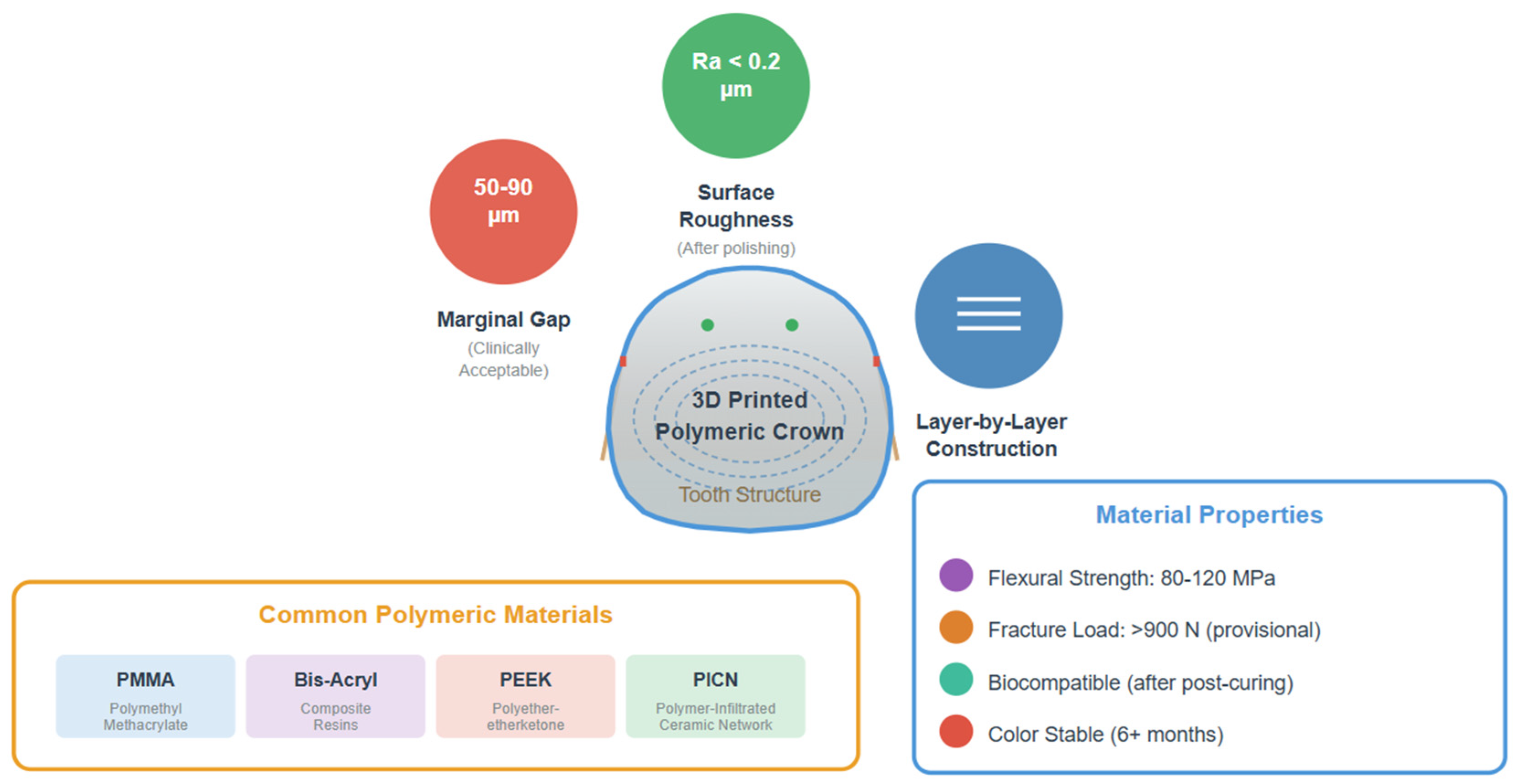 - The evolution of polymeric 3D-printed dental crowns mirrors the broader trajectory of additive manufacturing: initial applications in prototyping and tooling, gradual expansion into functional end-use parts, and eventual acceptance as a mainstream production technology. Dentistry is further along this curve than many industries, with provisional restorations already established in clinical practice.
