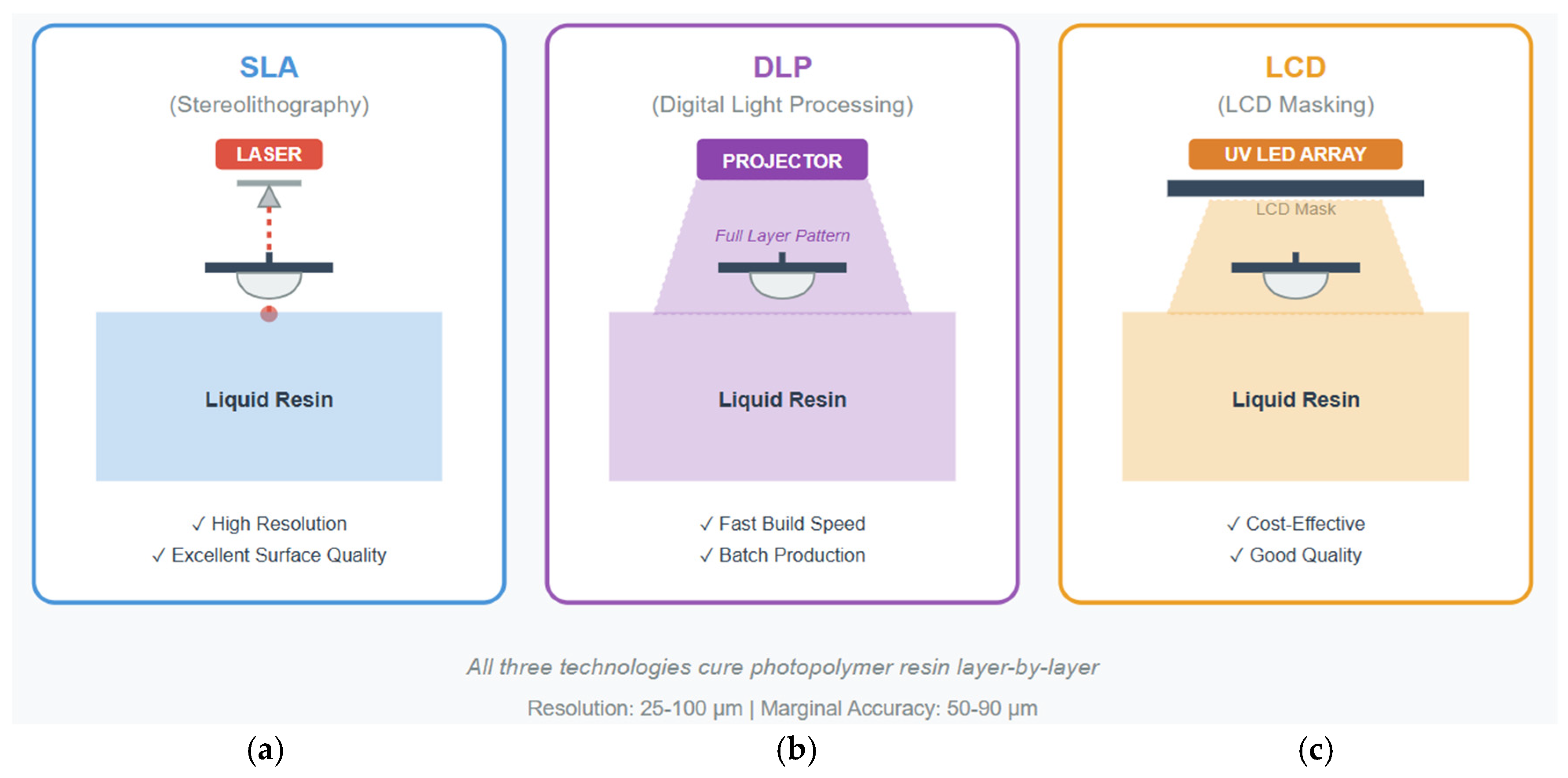 3.1. Vat Photopolymerization: The Premier Technology for Dental Applications