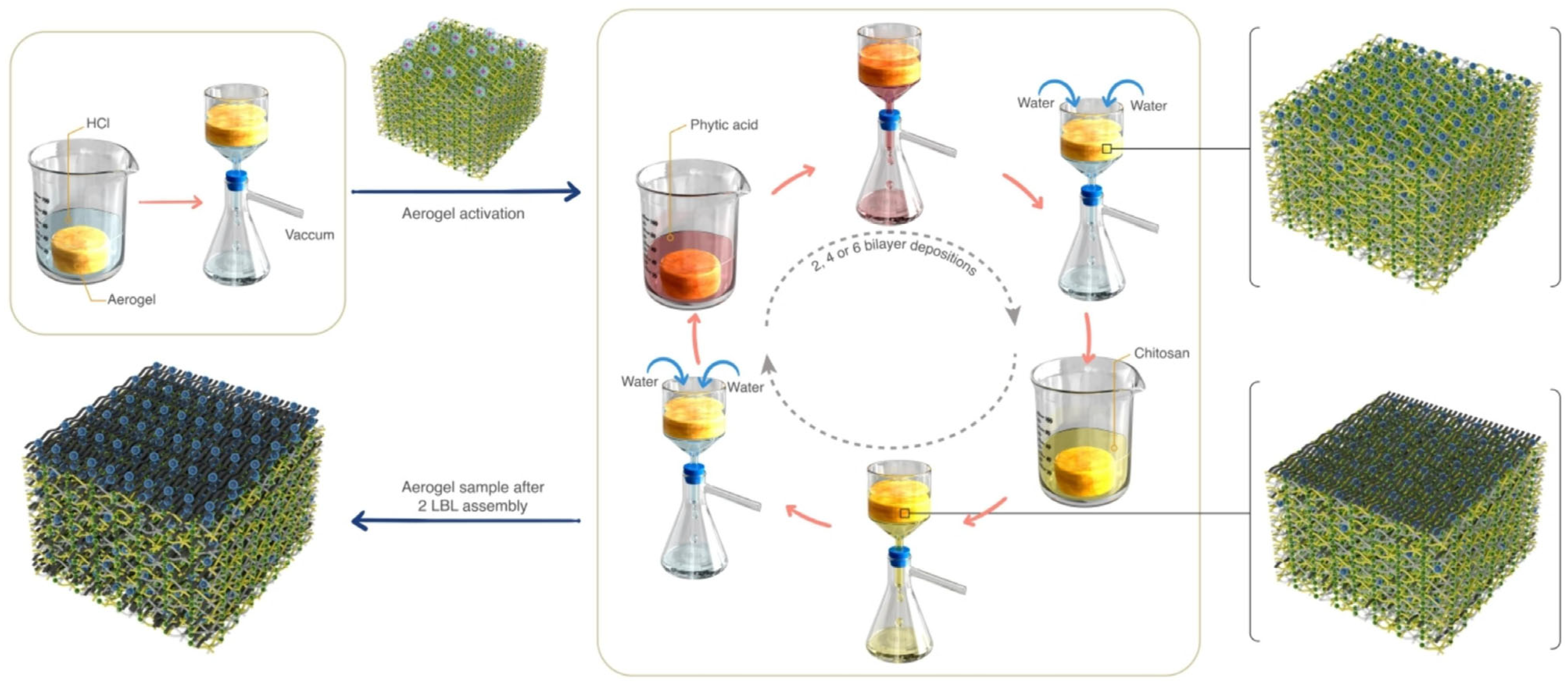 | Aerogel composed of (hydroxypropyl)methyl cellulose-methyltrimethoxysilane | Protonated polyethyleneimine- phytic acid ligands |