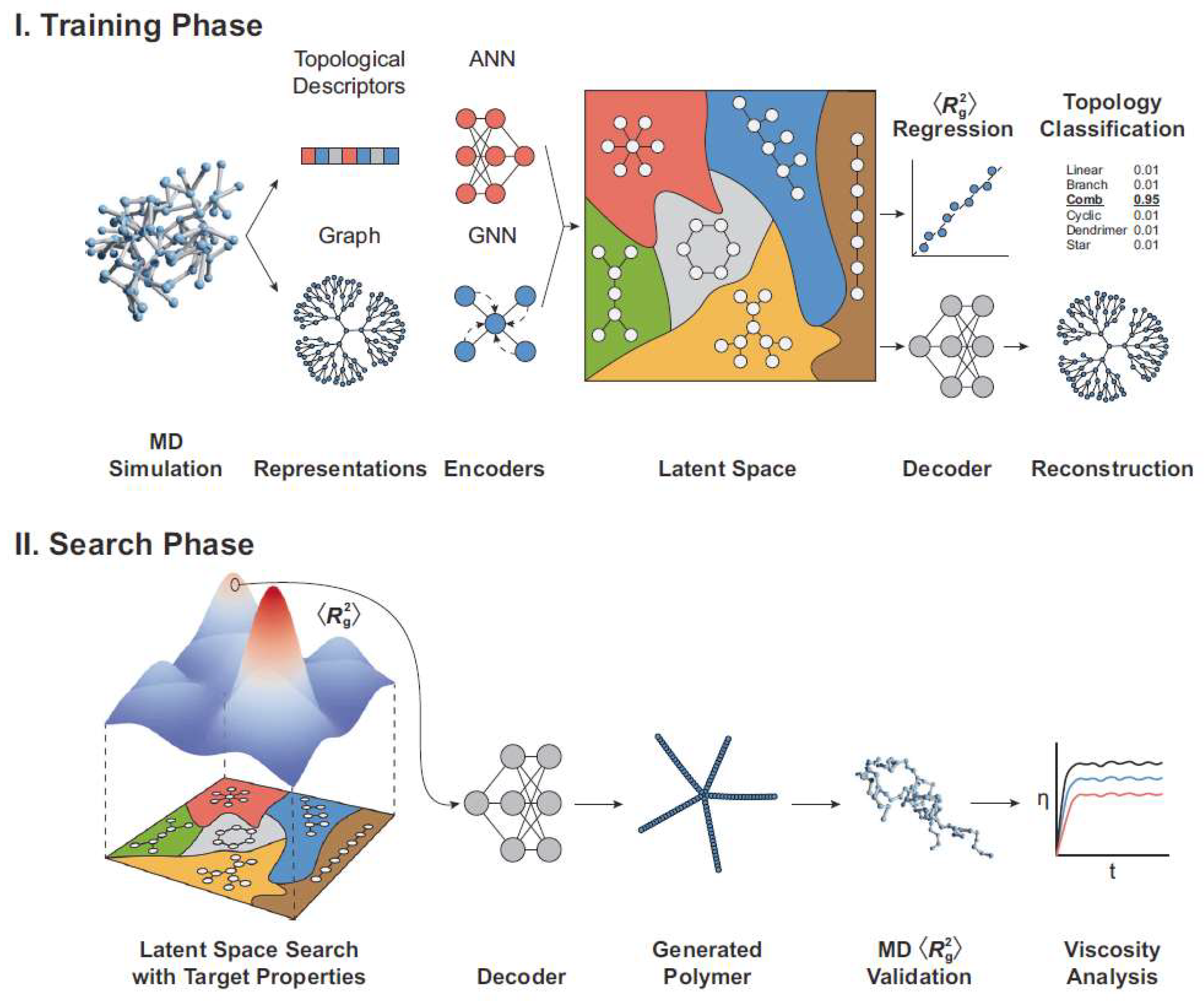 - Jiang, S.; Dieng, A.B.; Webb, M.A. Property-guided generation of complex polymer topologies using variational autoencoders. npj Comput. Mater. 2024, 10, 139. [Google Scholar] [CrossRef]