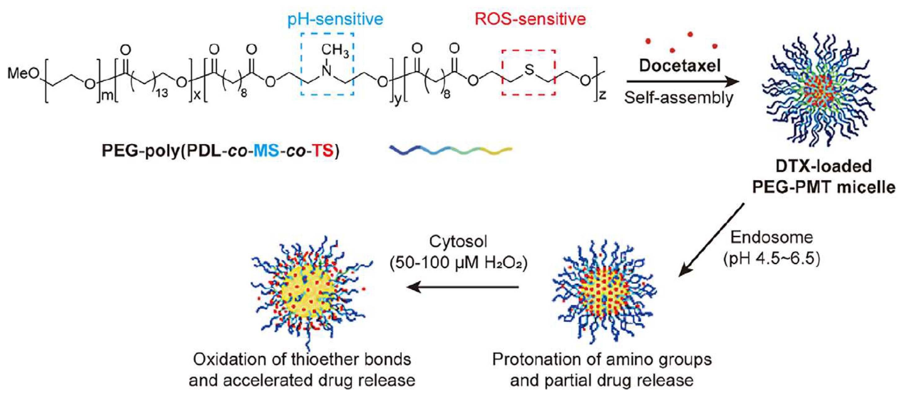 - Su, M.; Xiao, S.; Shu, M.; Lu, Y.; Zeng, Q.; Xie, J.; Jiang, Z.; Liu, J. Enzymatic multifunctional biodegradable polymers for pH- and ROS-responsive anticancer drug delivery. Colloids Surf. B Biointerfaces 2020, 193, 111067. [Google Scholar] [CrossRef]