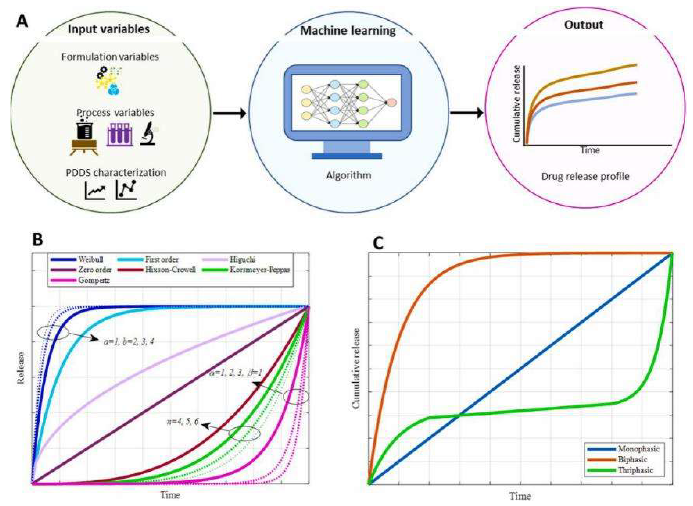 - Aghajanpour, S.; Amiriara, H.; Esfandyari-Manesh, M.; Ebrahimnejad, P.; Jeelani, H.; Henschel, A.; Singh, H.; Dinarvand, R.; Hassan, S. Utilizing machine learning for predicting drug release from polymeric drug delivery systems. Comput. Biol. Med. 2025, 188, 109756. [Google Scholar] [CrossRef] [PubMed]