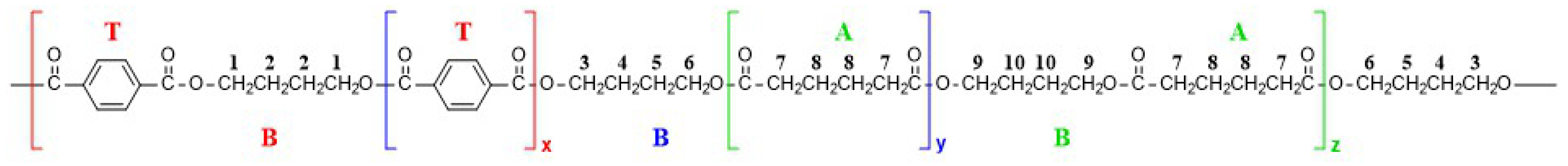 44], the block lengths of terephthalate units (BT) and adipate units (BA) were calculated, with values of 1.46 and 1.58 respectively; thus, they are very short sequences, and the degree of randomness had a value of 1.31, which means that the copolymer is mainly random.