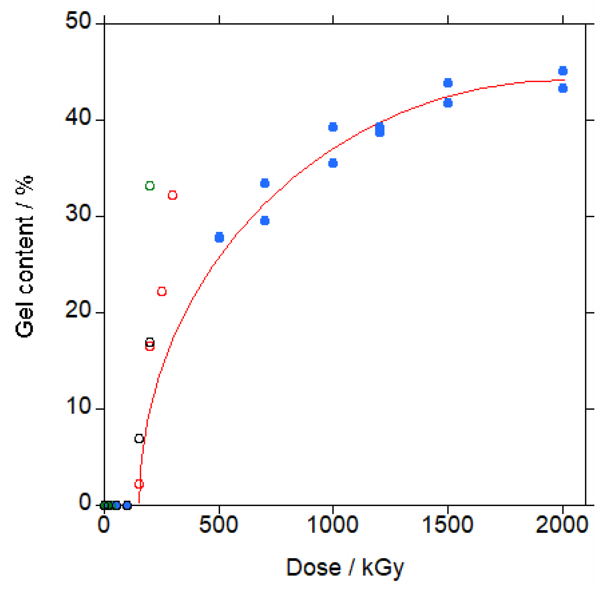 The gel content appeared in between 100 and 200 kGy, in agreement with the literature’s data (open circles in