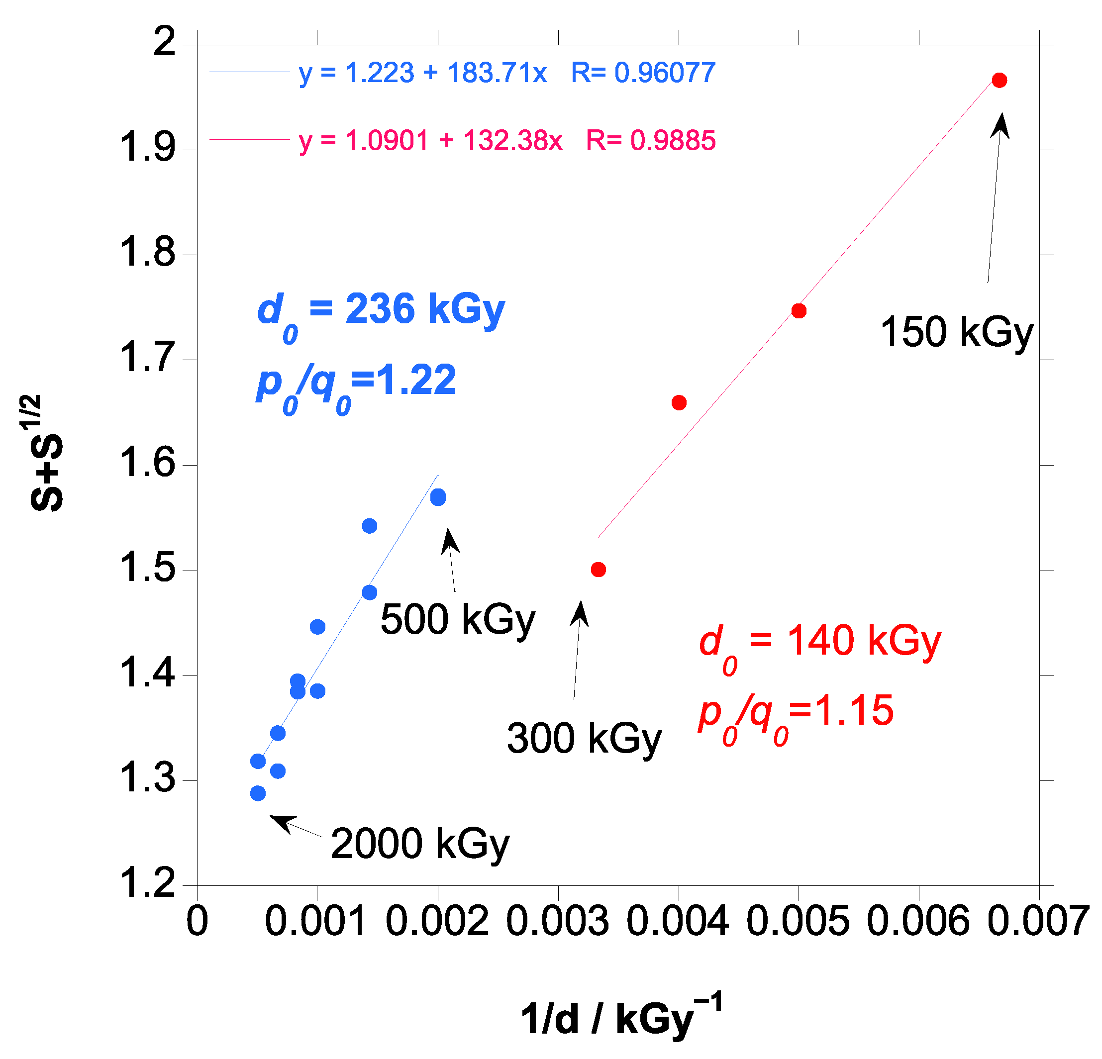 Figure 3 (red circles), it can be clearly seen that the missing data in our work from 150 to 500 kGy are key to determining precisely the minimum dose of gelation (intercept with s + s