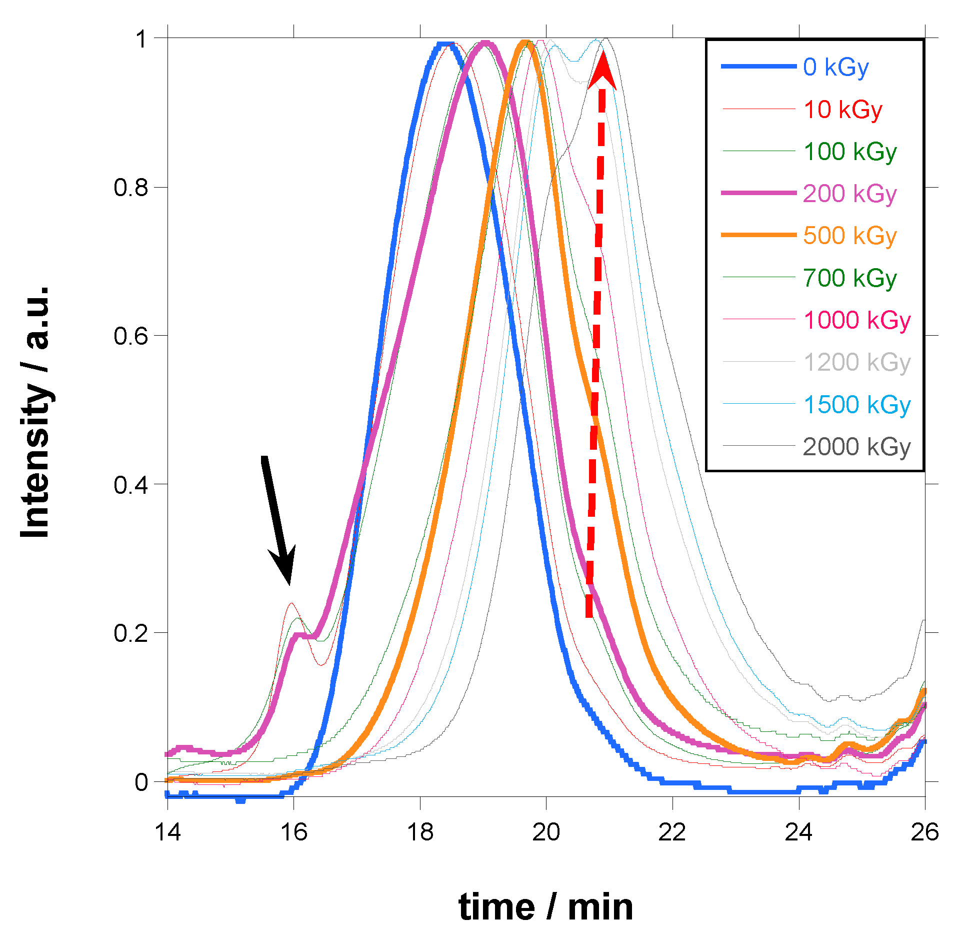Size Exclusion Chromatography (SEC) was used to determine the changes in molecular weight caused by gamma irradiation. PBAT samples were irradiated at 0 (unirradiated) 10, 20, 30, 50, 100, 200, 500, 700, 1000, 1200, 1500 and 2000 kGy for molecular weight determination. From 0 to 100 kGy, the measured molecular weight corresponds to the whole sample, whereas at 200 kGy and above, because of the existence of a crosslinked and therefore insoluble material, the measured molecular weight corresponds only to the soluble part of the material.