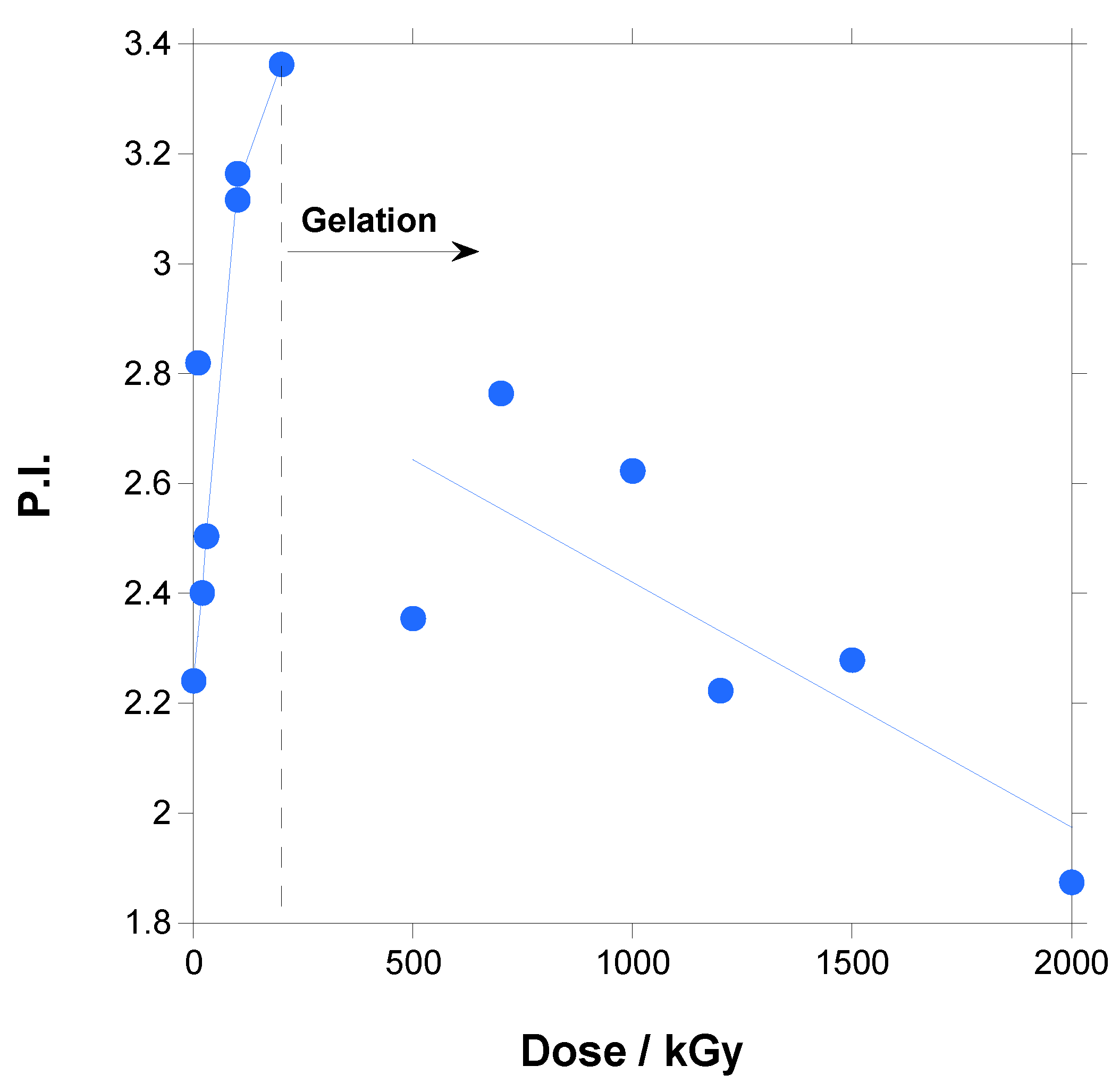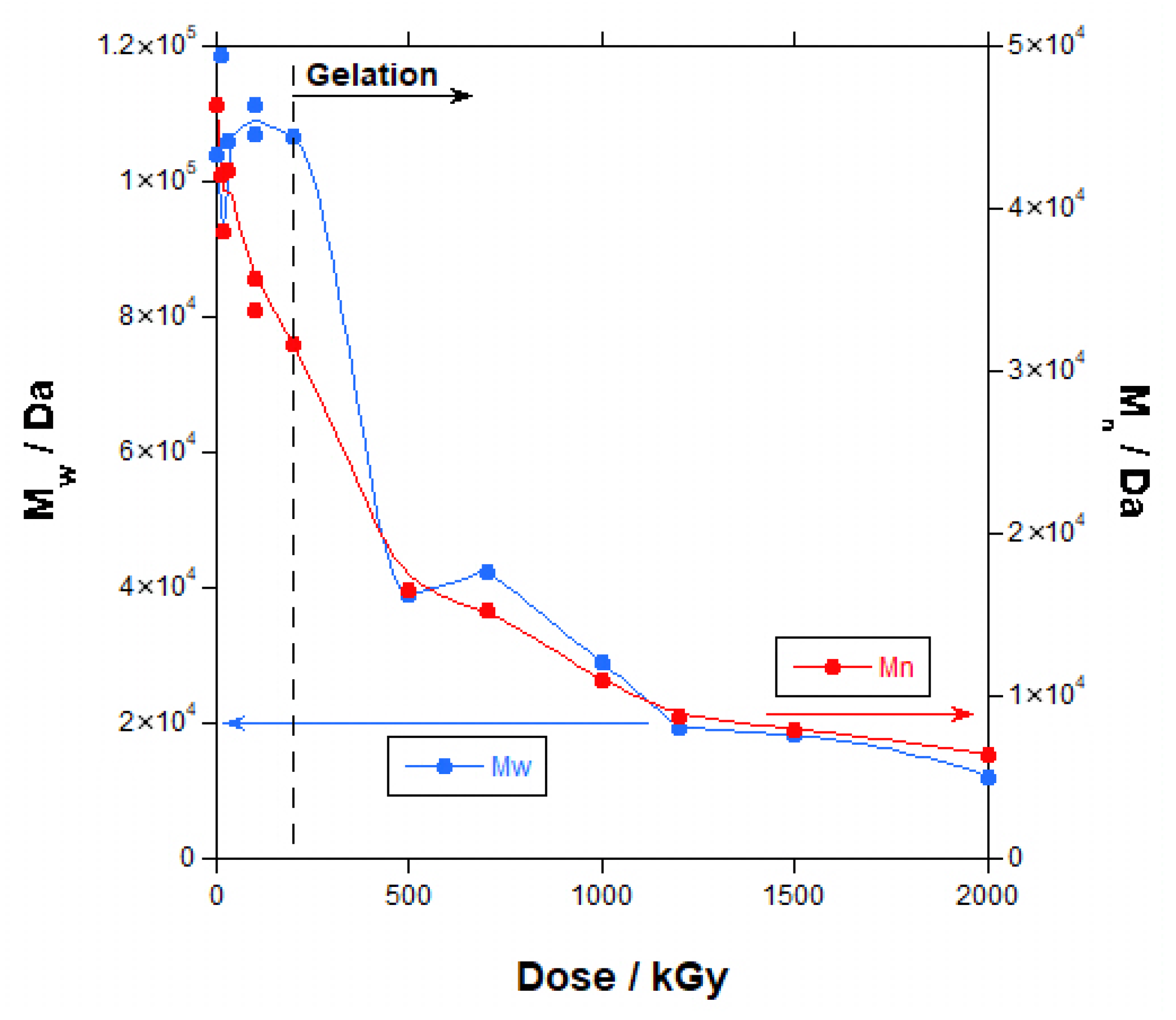 Up to 100 kGy, no gel was found. For 200 kGy, gel was present, as proven by the impossibility to filter the solution because the filter clogged, and could not be separated. Above 200 kGy, the gel content initially increased rapidly, and more slowly at increased doses, with a maximum gel content of approximately 44% weight at 2000 kGy.