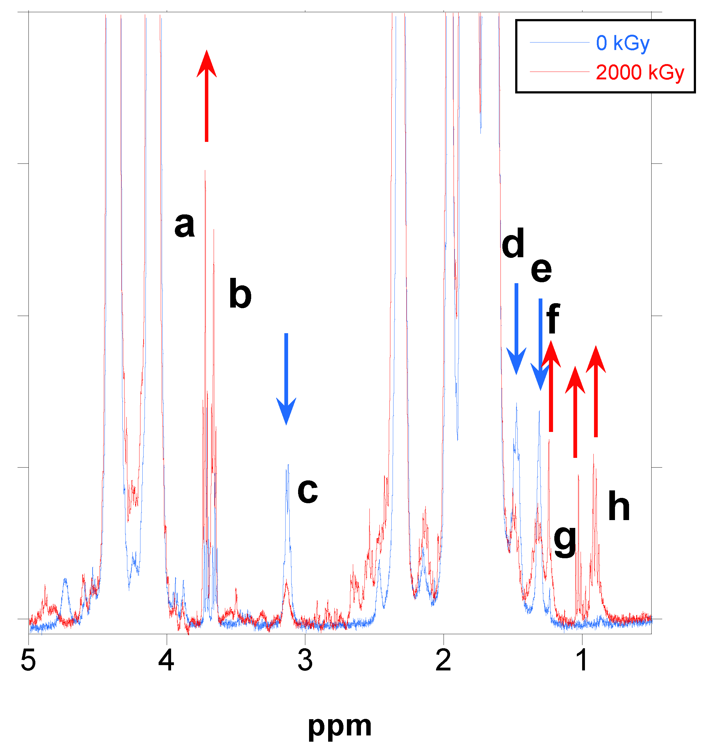 Figure 4) appears at 10 kGy and completely disappears at 500 kGy. At high irradiation doses, a shoulder at long times due to low molecular weight chains develops to a peak at 1200 kGy and becomes the main peak in 2000 kGy (pointed out by a red dashed arrow in