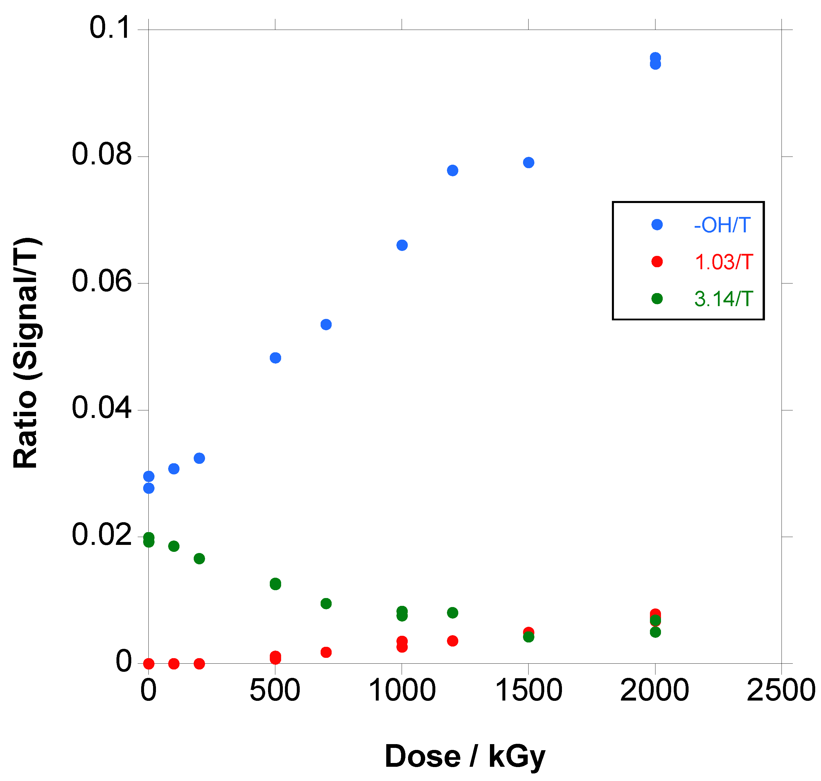 −1, of the order of the changes in the literature, virtually do not change with dose up to very high doses; thus, again, we consider that with only one measurement at each dose and the limited range of irradiation, the contradictory trends found in the literature are not significant.