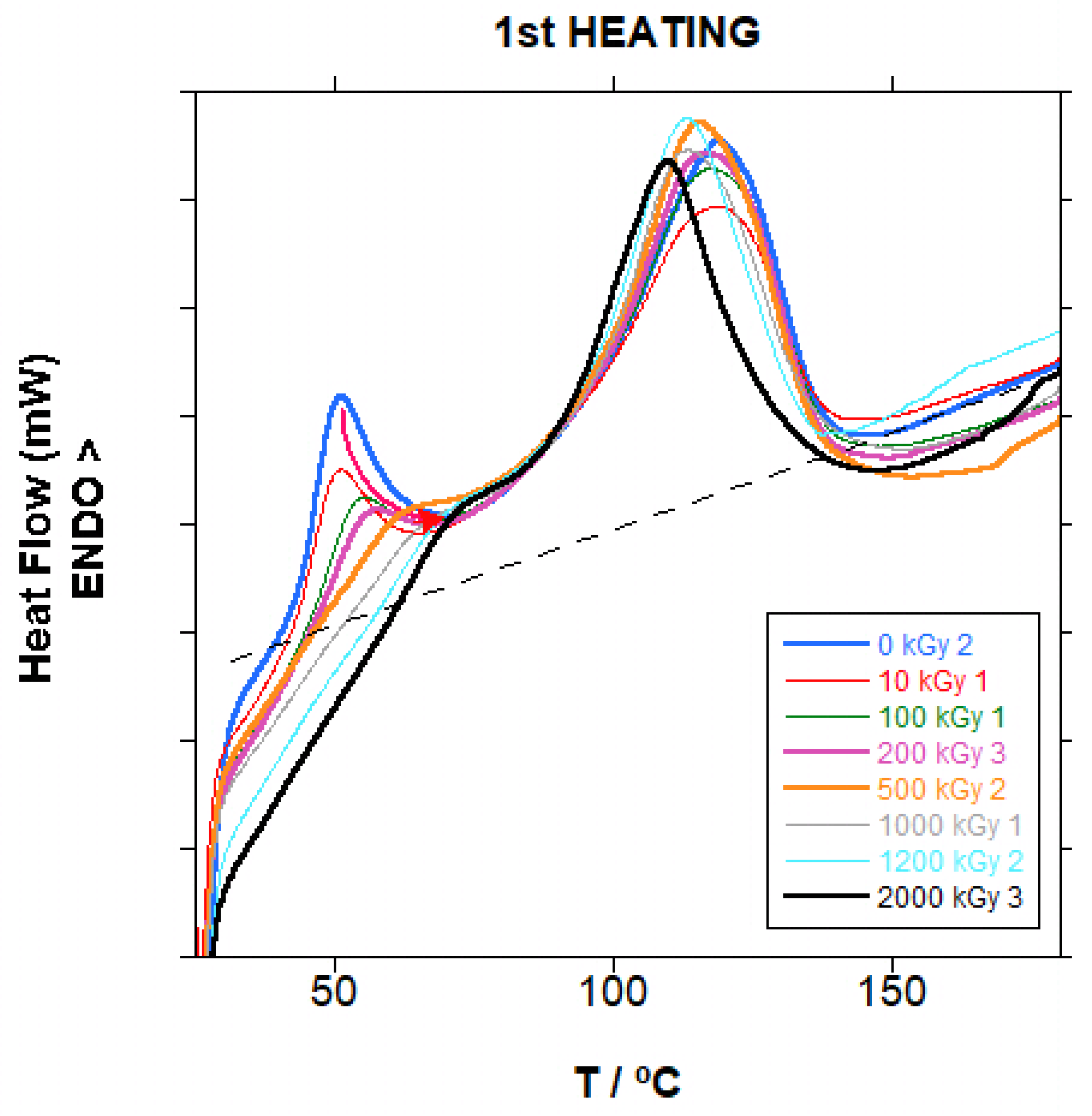Figure S19 in the Supplementary Materials), starting at 120–123 °C at 0 kGy, similarly to our value of approximately 121 °C, its value decreased by 1.5 °C in doses up to 50 kGy [