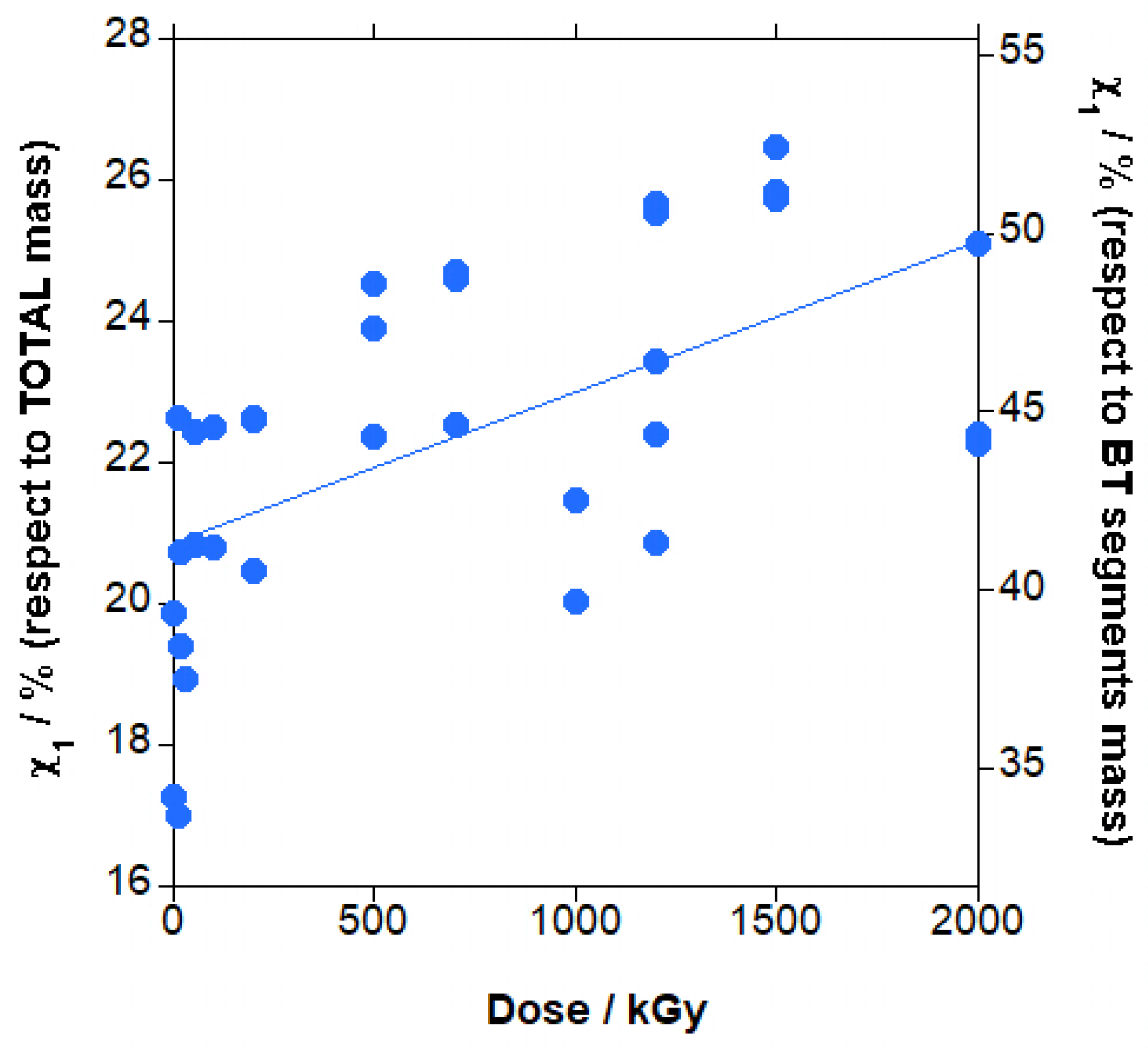 Figure 12, the increase could be considered to be mainly up to 500 kGy, the dose for which a significant amount of crosslinked material is found, and at higher doses, crystallinity is practically constant, in coincidence with the trend of Young’s Modulus (