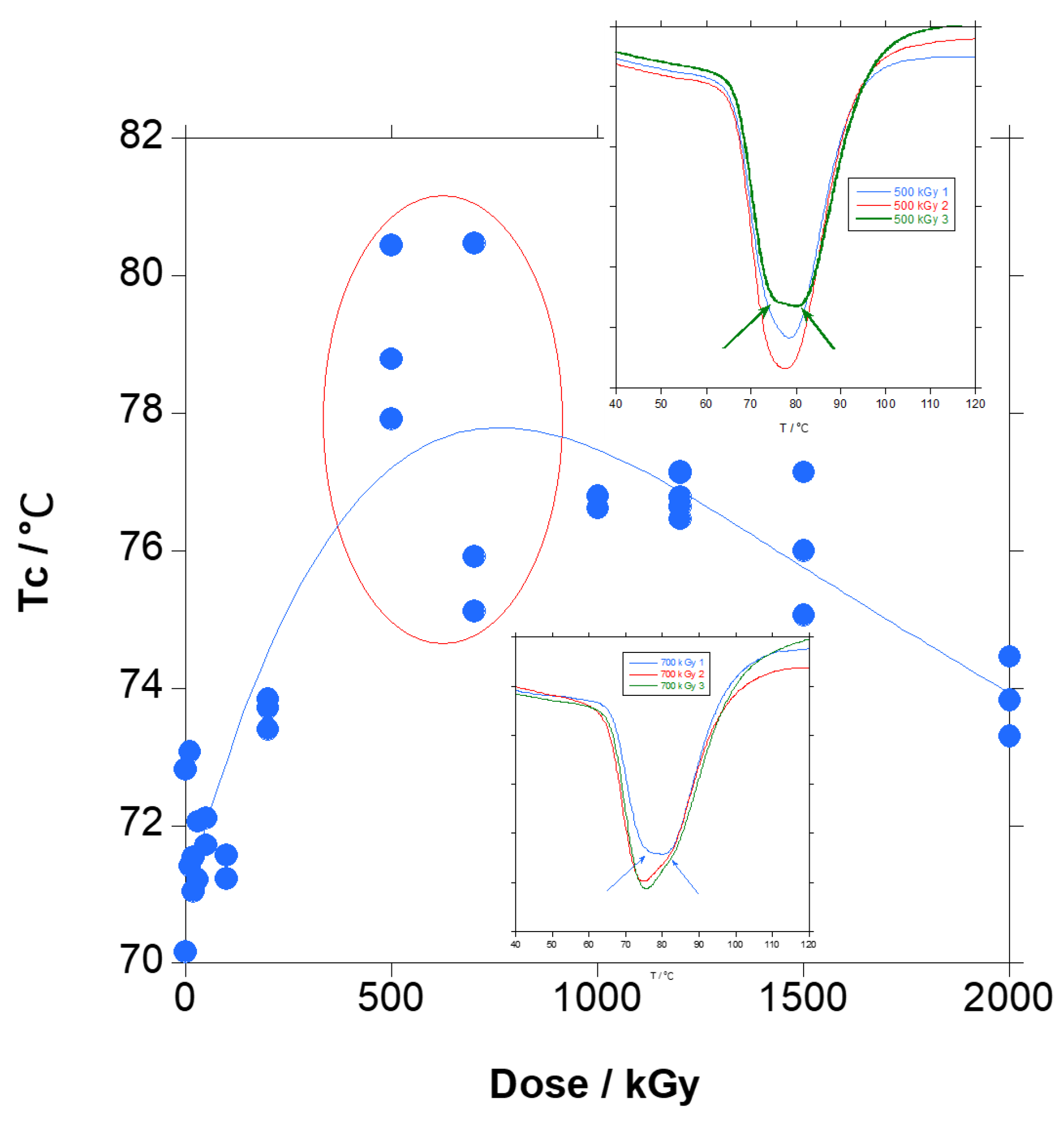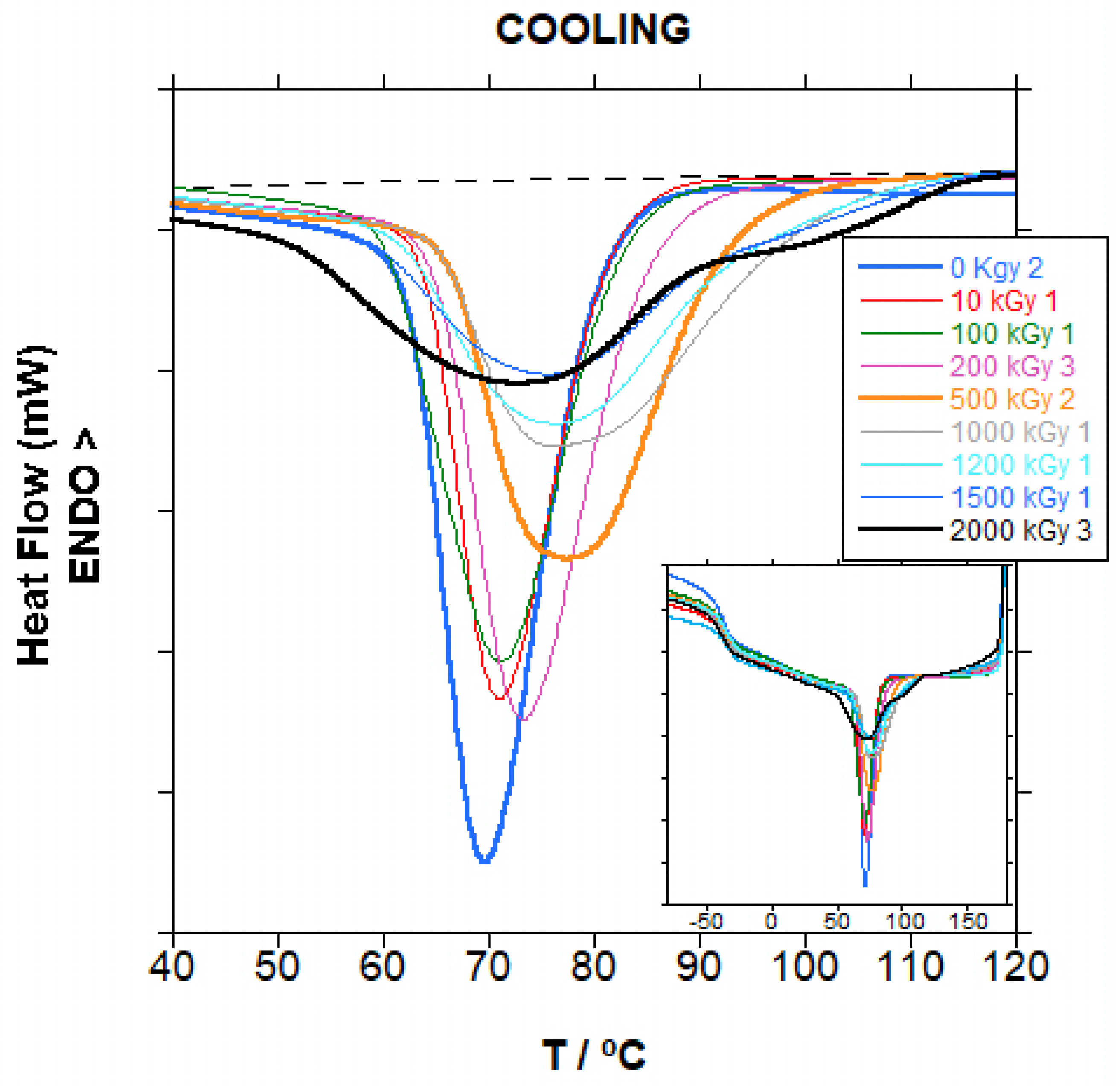 Figure 14, despite the dispersion due to the difficulty to draw the base line, it seems that the peak temperature increased slightly until approximately 500 kGy and then it slightly decreased, a trend that we consider significant. Up to 500 kGy, when the amount of gel is already significant, the effect of chain scission dominates, and crystallization is favoured by the shorter chains. At 500 and 700 kGy, the dispersion is at its maximum. If the peak is looked at closer, shown in the insets in