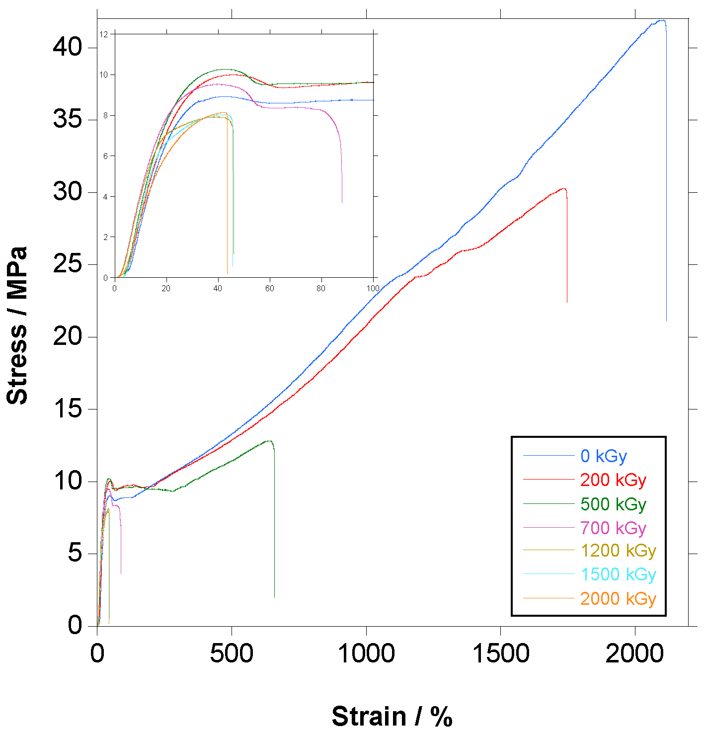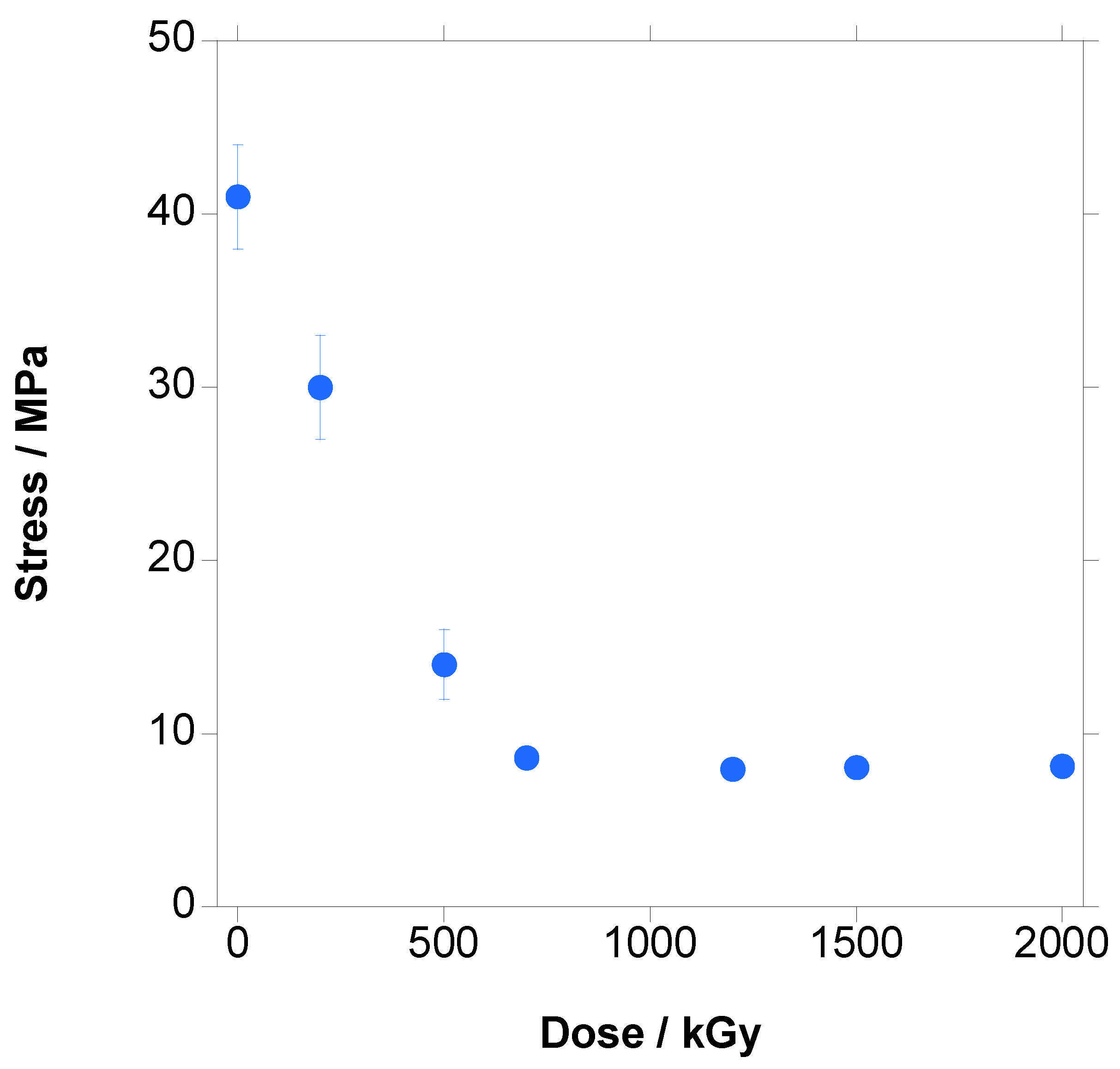 Figure 19, with a quasi-linear decrease until 700 kGy (from 41 to 8.6 MPa), followed by a constant value; the explanation is the same as for strain, pertaining to the combined harmful effect of crosslinking and chain scission.