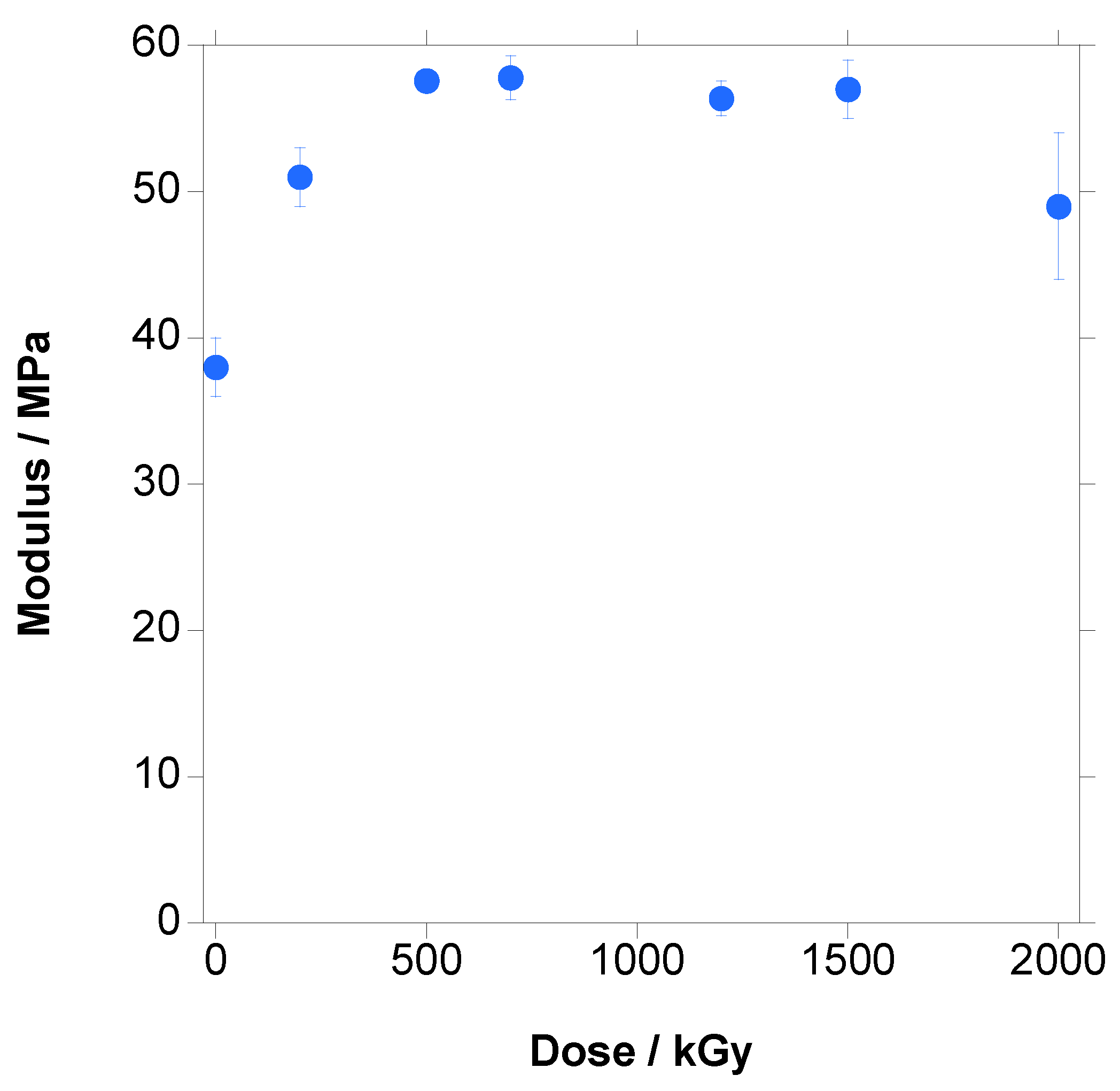 When the literature’s data for PBAT are compared, Young’s Modulus, measured up to 300 kGy [