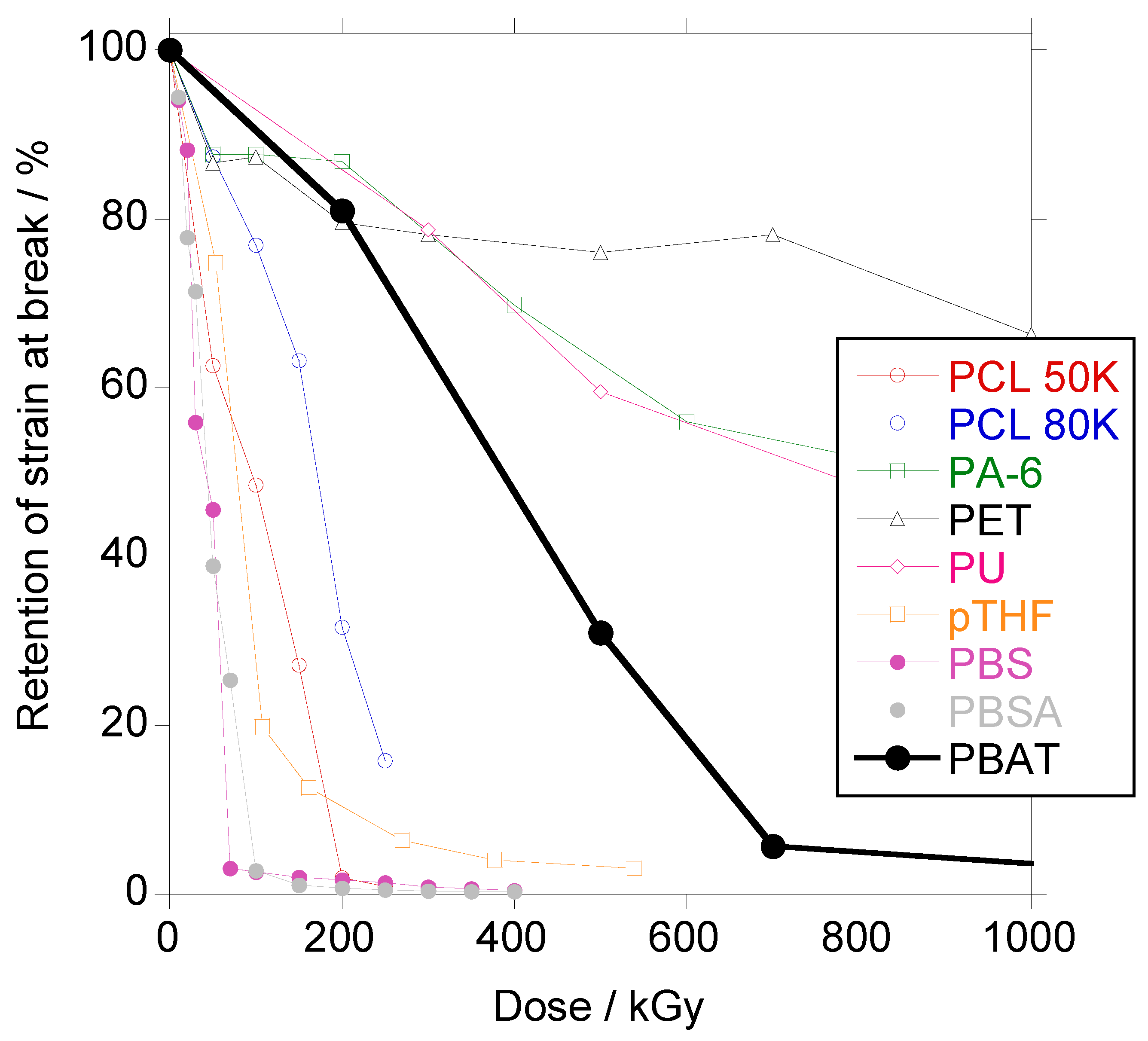 Figure 20, the results for tensile strength and elongation at break for PBAT, in terms of the retention of the property in comparison with other irradiated materials studied in the Elastomers’ group in Spain, are presented, respectively. PBAT shows a fairly good resistance to ionizing radiation, only below PU [