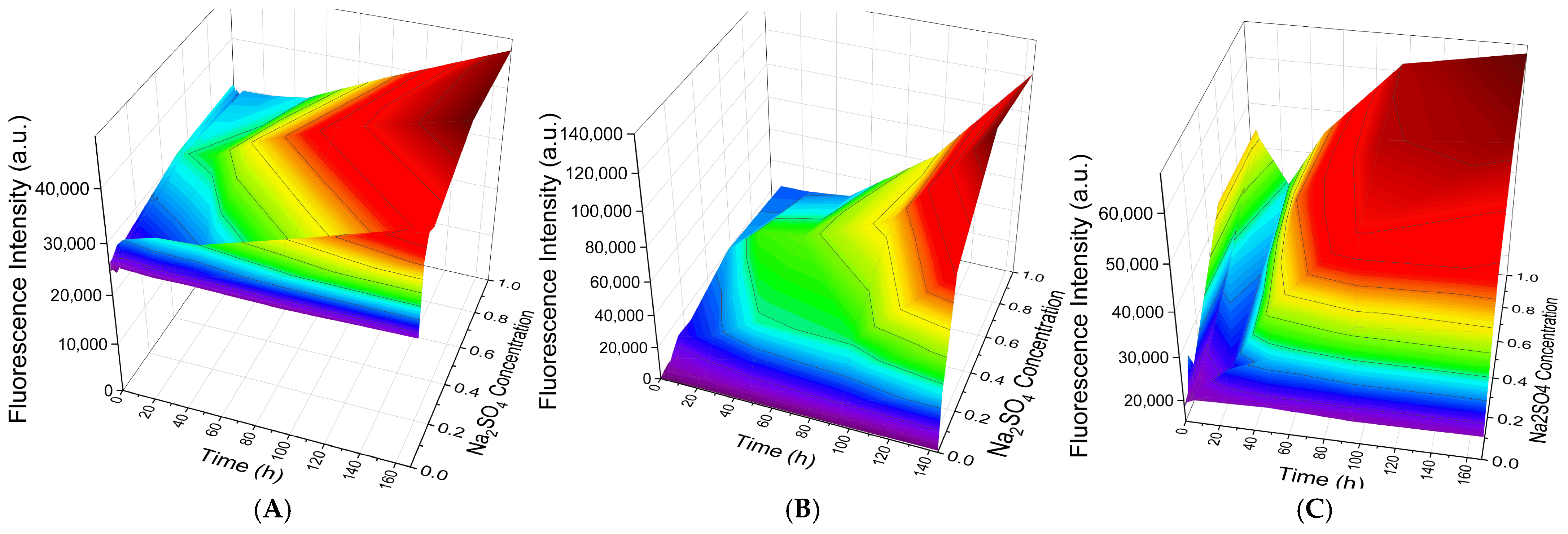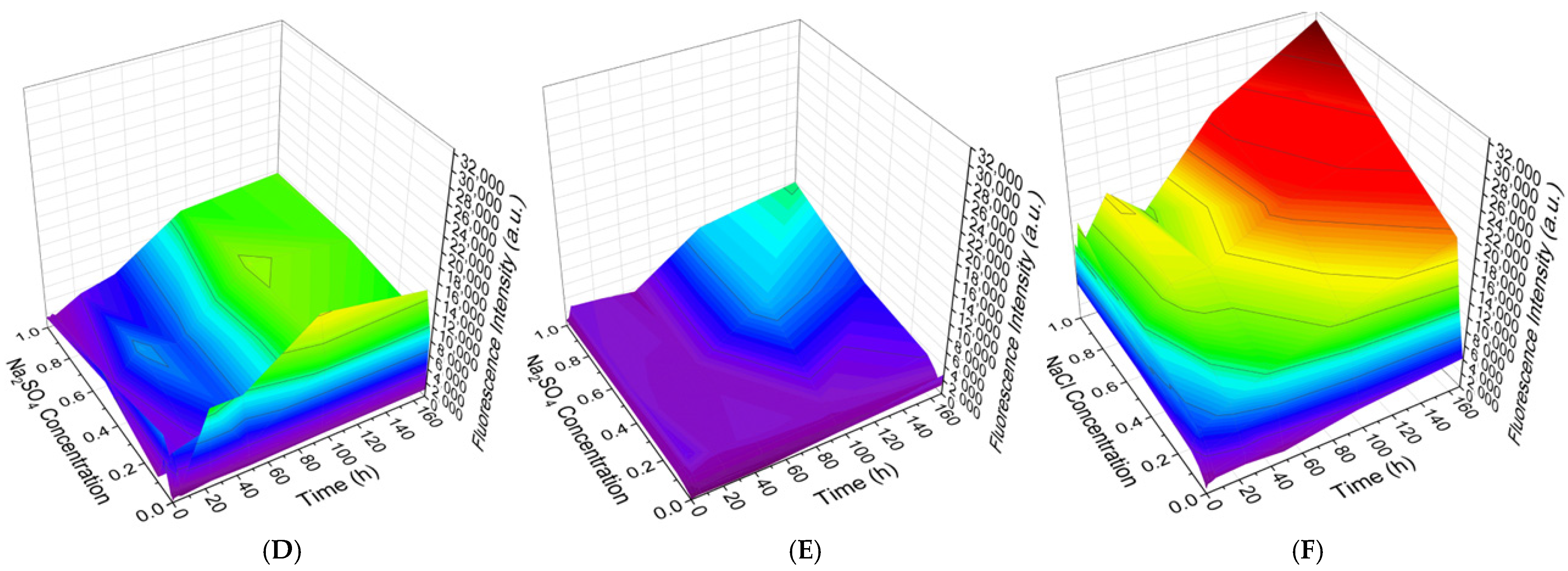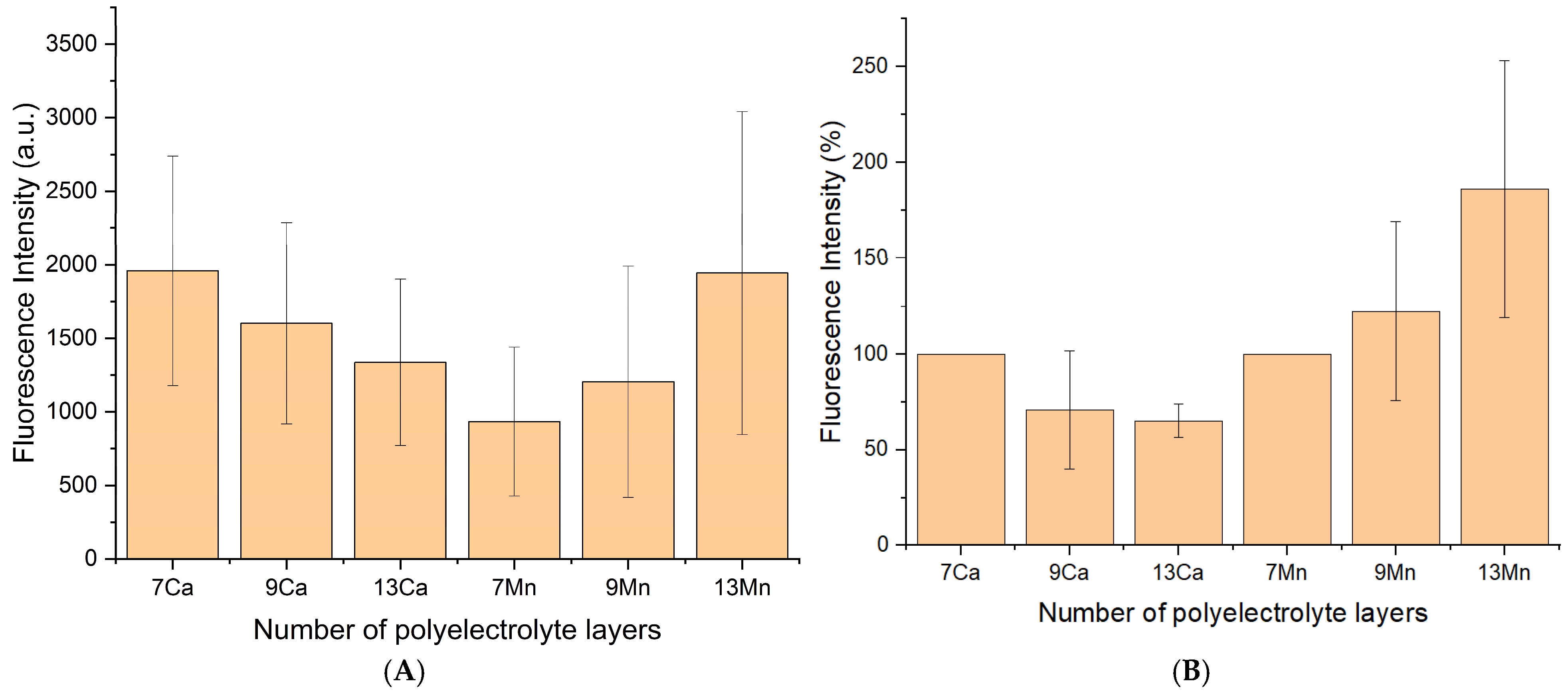 For CaCO3-templated capsules, no statistically significant differences in PAH dissociation were observed either among samples with different numbers of layers (7, 9, 13) or upon variation of Na2SO4 concentration (0.01–0.1 M) (Tukey HSD post hoc test, p > 0.05). A similar pattern was observed for MnCO3-templated capsules (no statistically significant differences): the number of layers did not affect dissociation (p > 0.05), while variation in Na2SO4 concentration led to a minor increase in supernatant fluorescence.