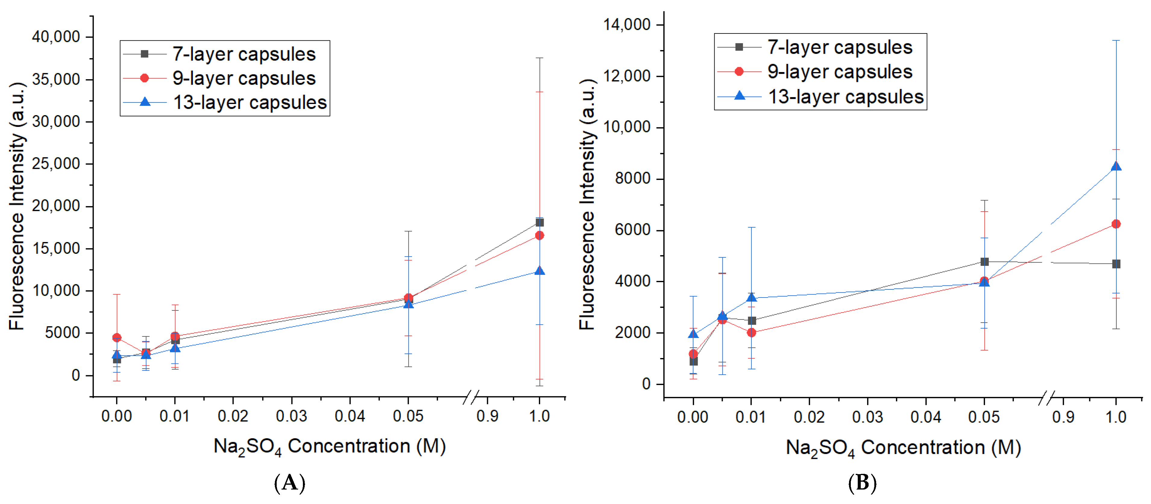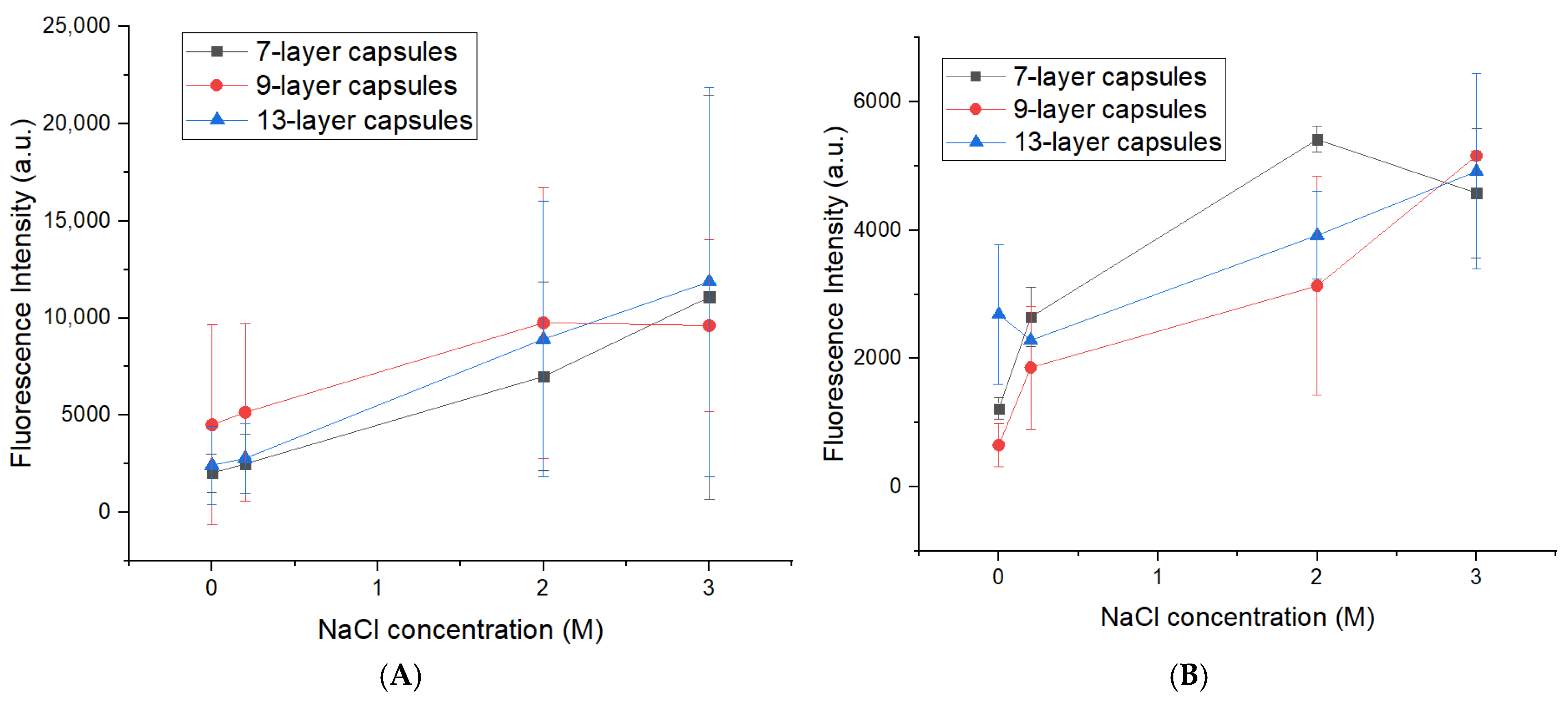 p < 0.05). Maximum dissociation was recorded in 3.0 M NaCl, where the fluorescence intensity of the supernatant increased by 900 ± 250% relative to the baseline level. The obtained data refute the hypothesis that the number of layers within the investigated range is not a determining factor for both capsule types.
