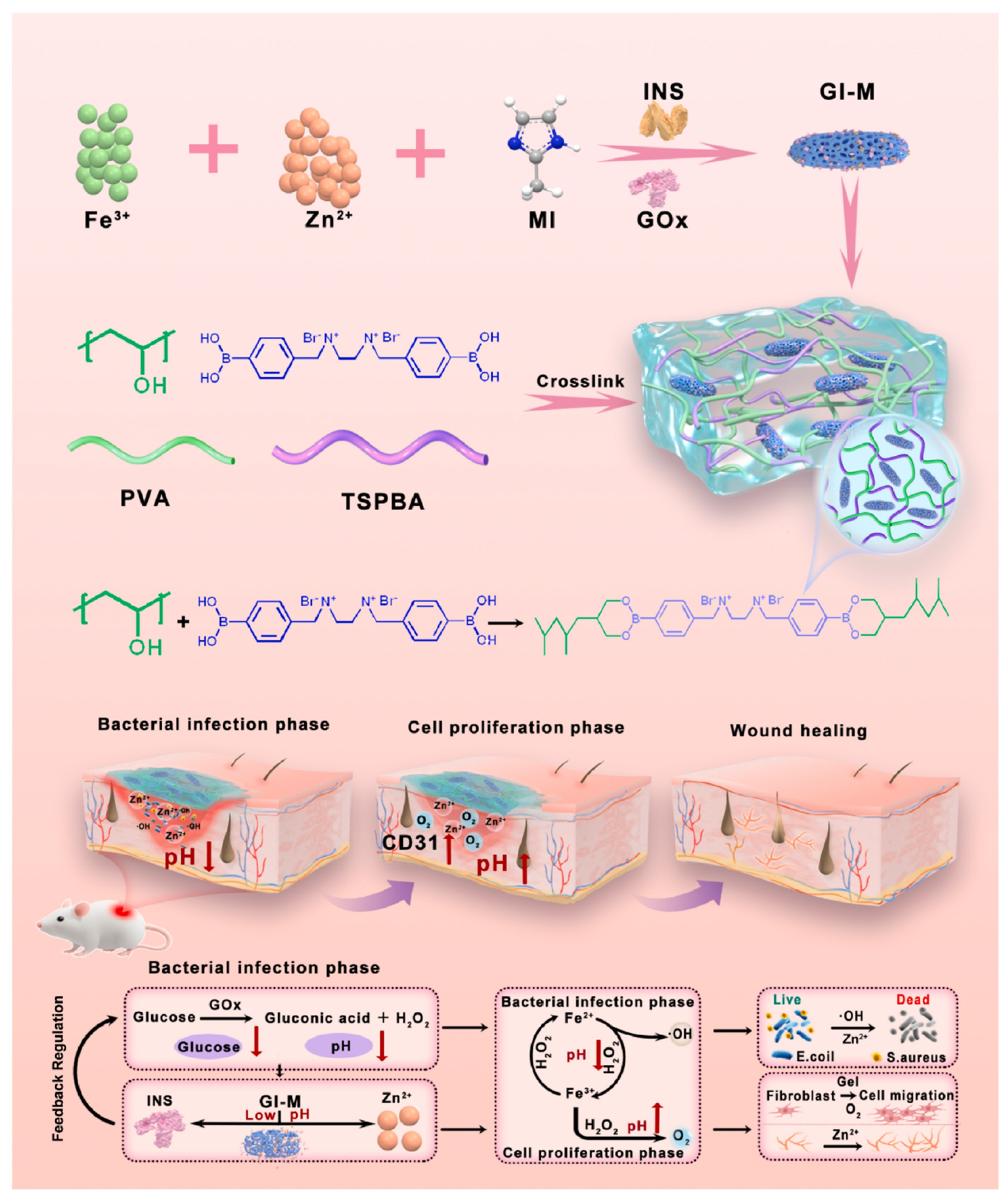 - Chen, R.; Wang, P.; Xie, J.; Tang, Z.; Fu, J.; Ning, Y.; Zhong, Q.; Wang, D.; Lei, M.; Mai, H.; et al. A Multifunctional Injectable, Self-Healing, and Adhesive Hydrogel-Based Wound Dressing Stimulated Diabetic Wound Healing with Combined Reactive Oxygen Species Scavenging, Hyperglycemia Reducing, and Bacteria-Killing Abilities. J. Nanobiotechnol. 2024, 22, 444. [Google Scholar] [CrossRef]
