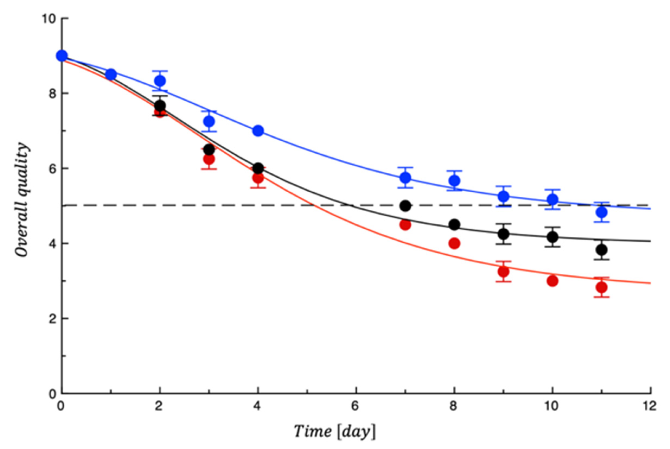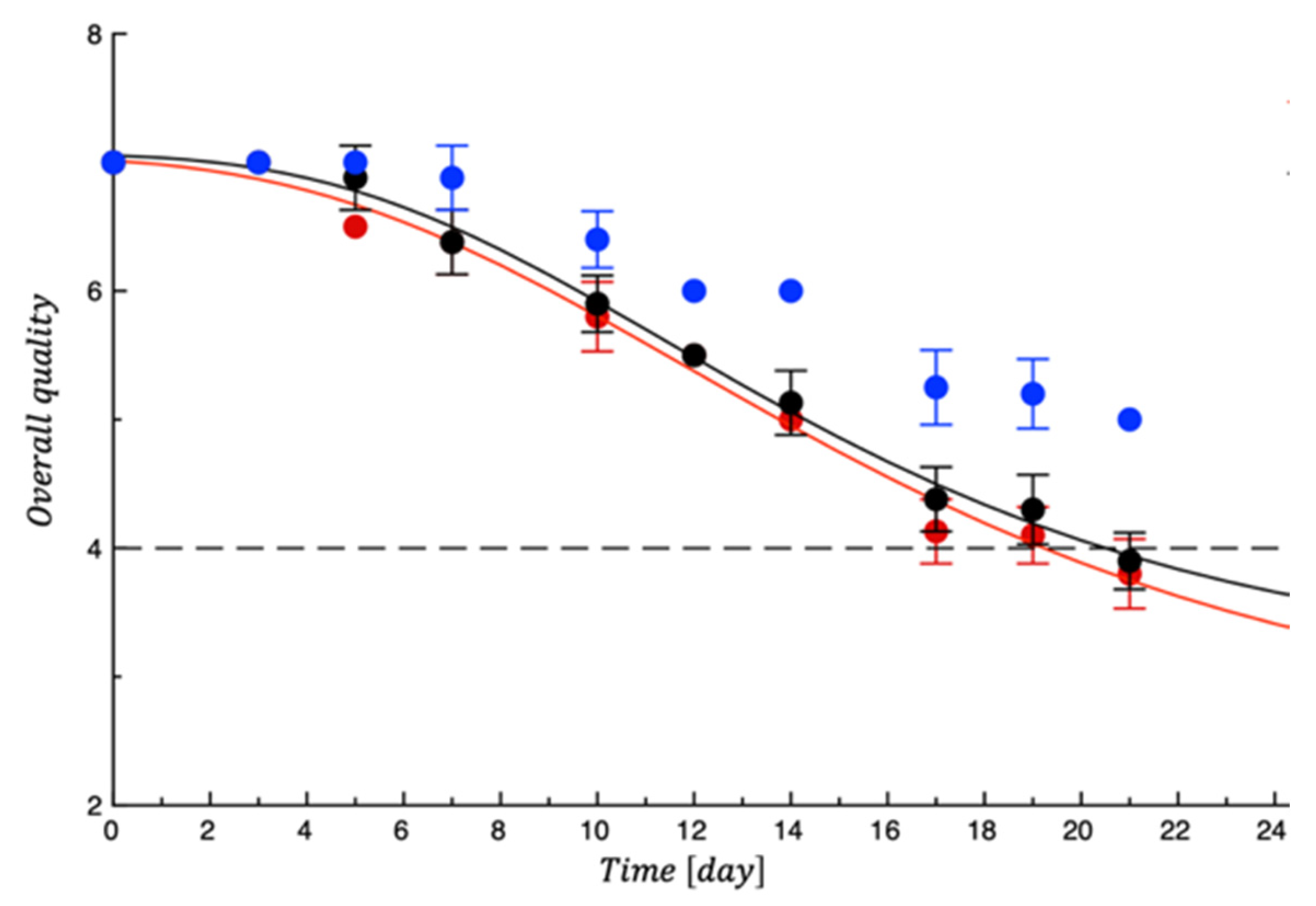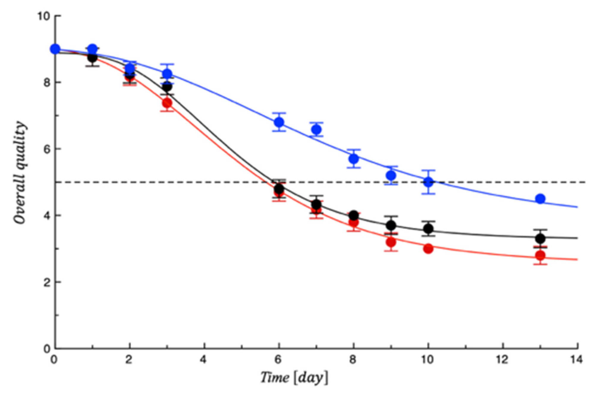 | Mesophilic Bacteria (1 × 107) | Pseudomonas spp. (1 × 106) | Coliforms (1 × 105) | Score > 4 | ||