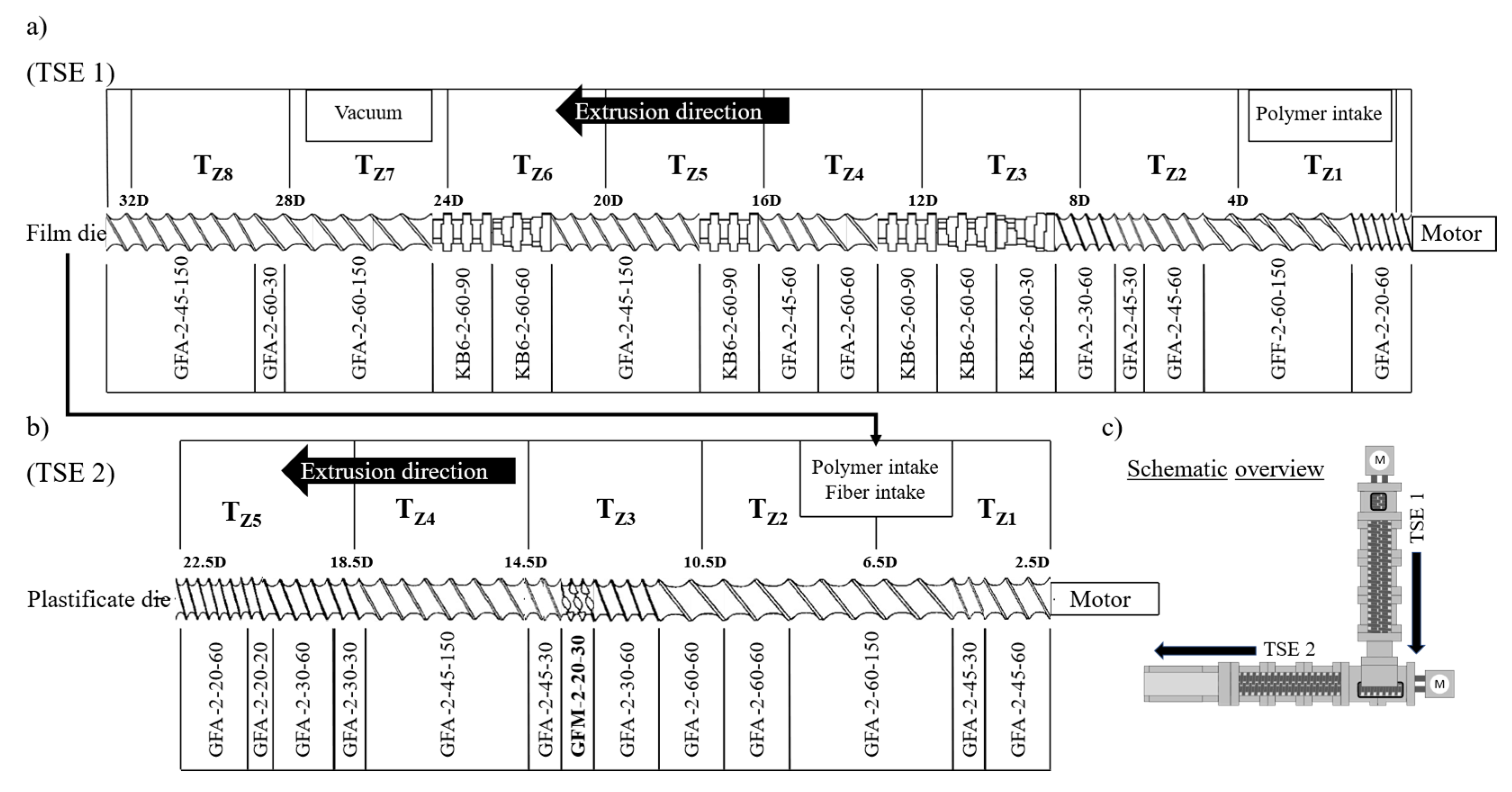 - Inceoglu, F.; Ville, J.; Ghamri, N.; Pradel, J.L.; Durin, A.; Valette, R.; Vergnes, B. Correlation between processing conditions and fiber breakage during compounding of glass fiber-reinforced polyamide. Polym. Compos. 2011, 32, 1842–1850. [Google Scholar] [CrossRef]