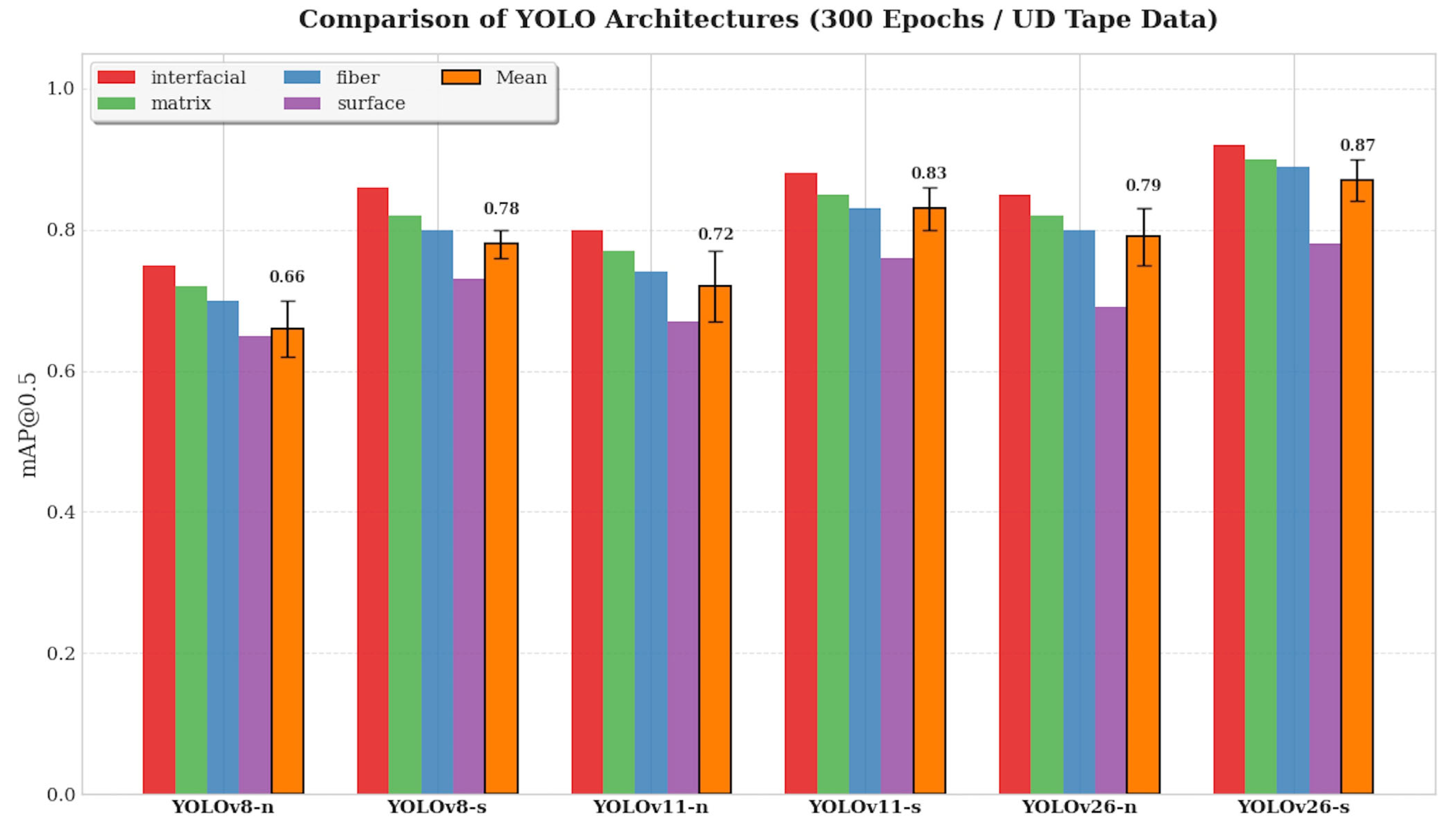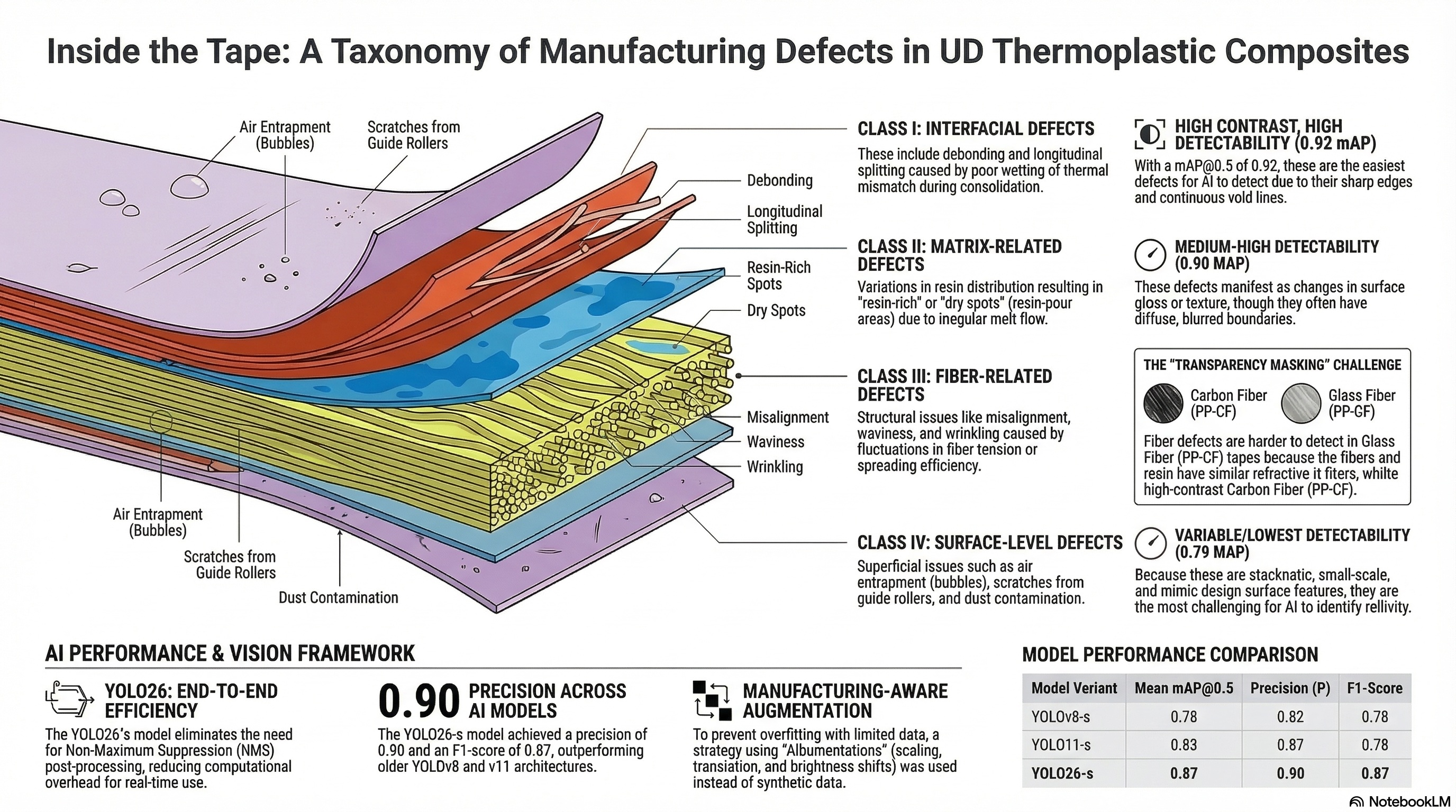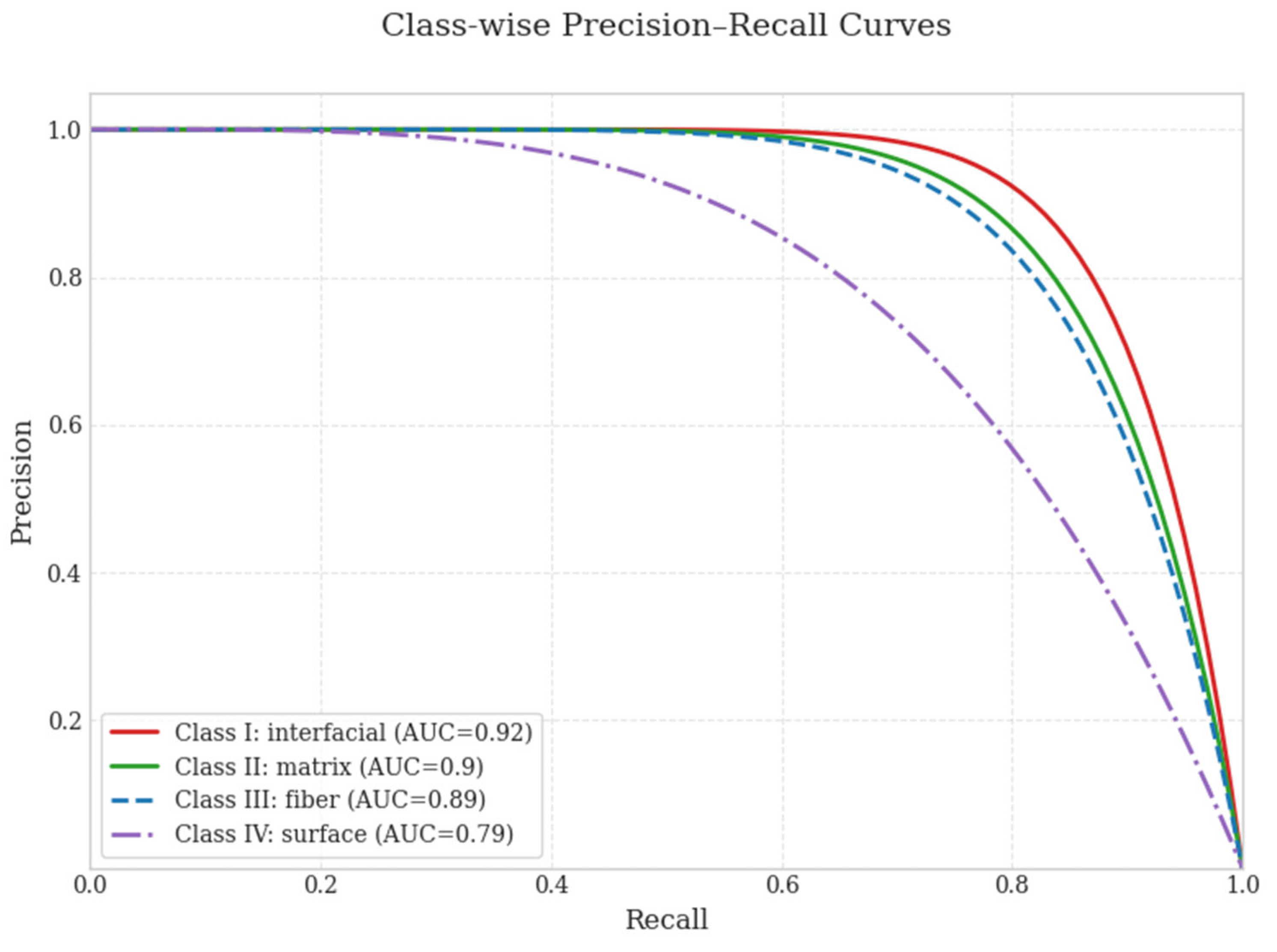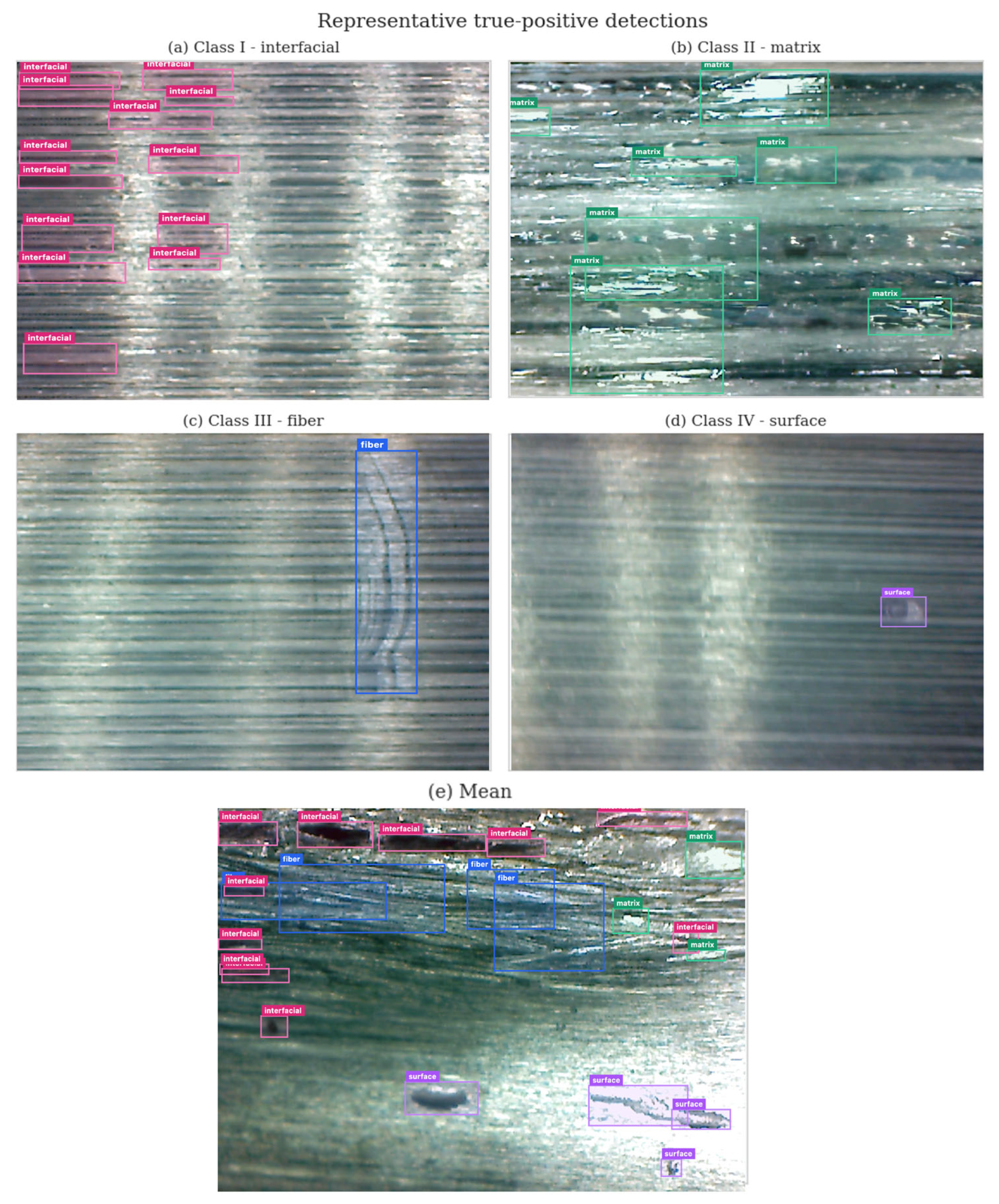 | Class III | fiber | Fiber-related defects | 0.89 ± 0.03 | 0.89 ± 0.03 | 0.87 ± 0.04 | 0.88 | Fine scale, requires multi-modal analysis |