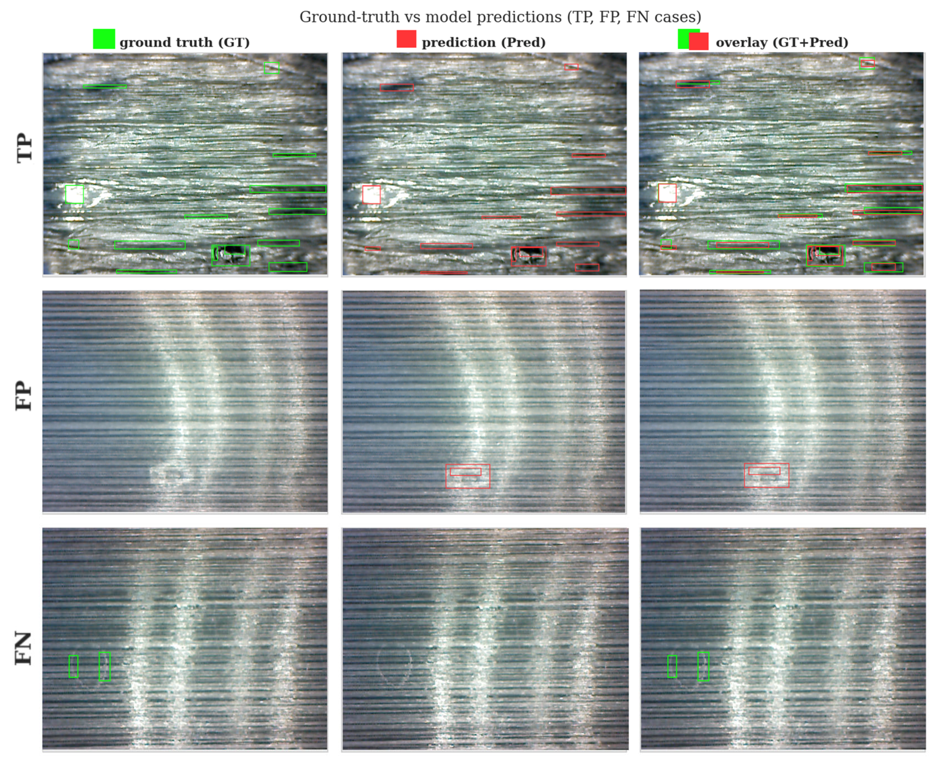 - FN (False Negative): A region that truly contains a defect but is missed by the model and incorrectly classified as defect-free.