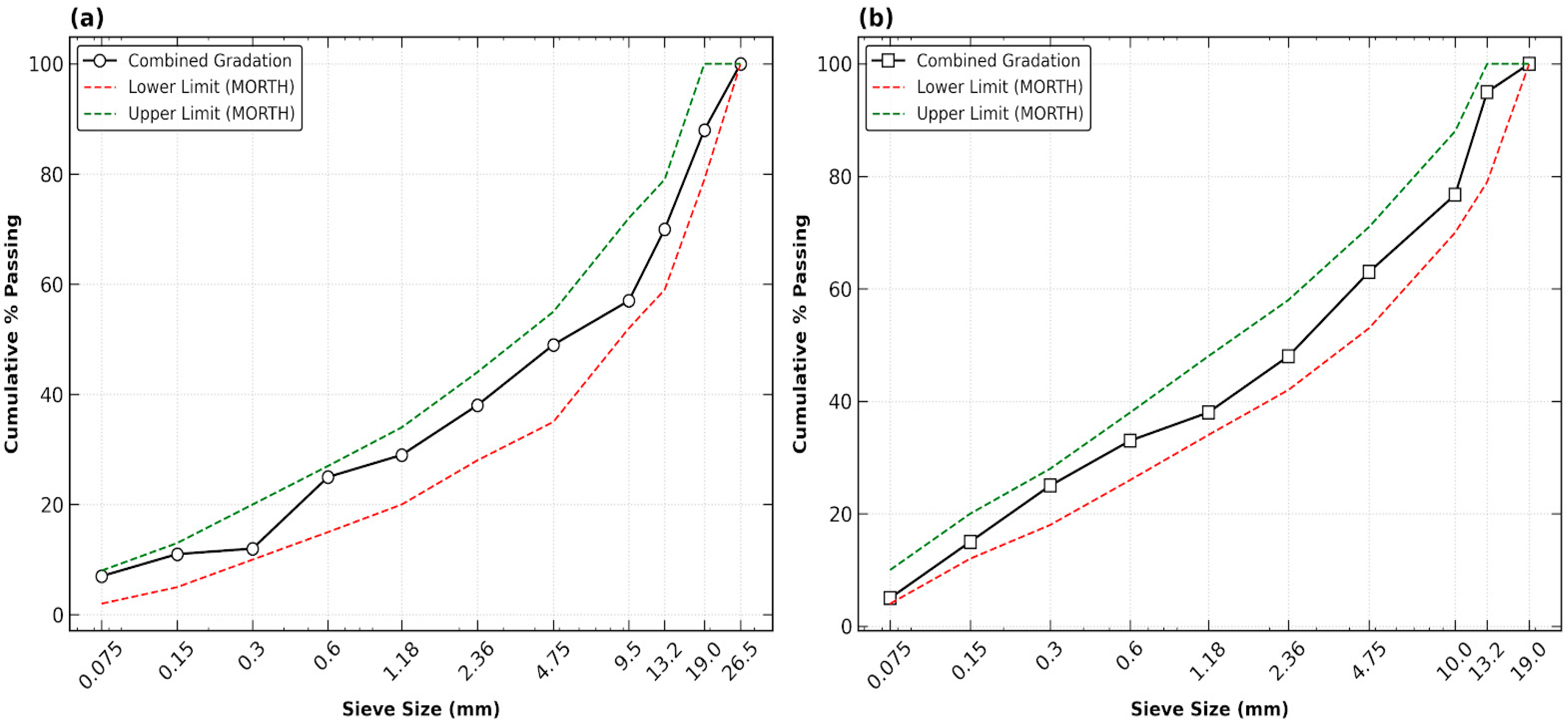 Figure 1, both gradations fall within the specified limits but provide different surface area to volume ratios. The 13 mm gradation represents a denser, finer matrix, while the 19 mm gradation provides a coarser stone-to-stone contact skeleton. The two gradings used in this study are: