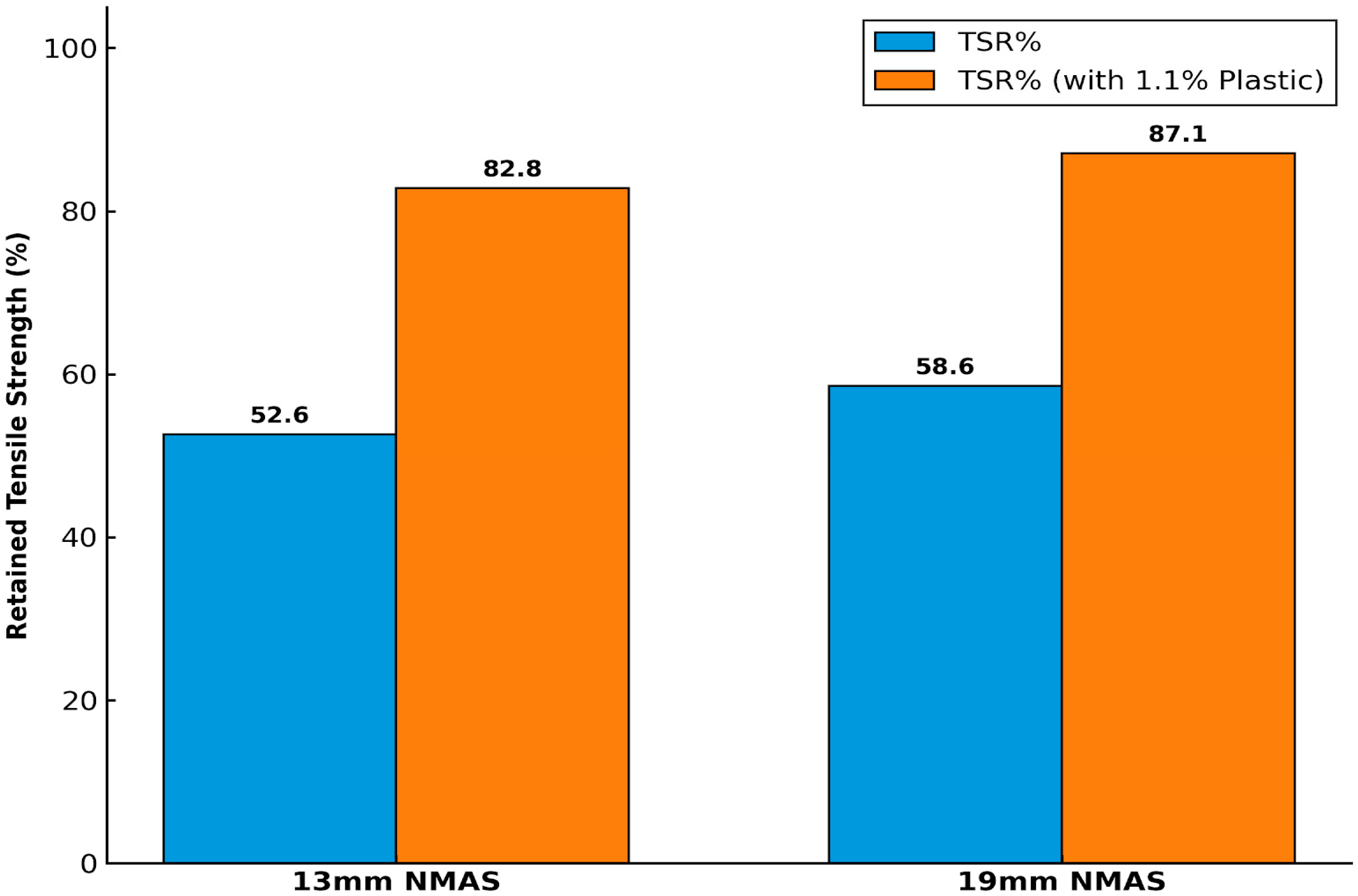 The moisture resistance results achieved in this study represent a significant improvement over conventional bituminous mixes and compare favorably with other polymer-modified asphalt studies. For instance, while the inclusion of waste plastic in bituminous mixes has been shown to improve moisture resistance, TSR values typically range between 82% and 88% for standard aggregates [