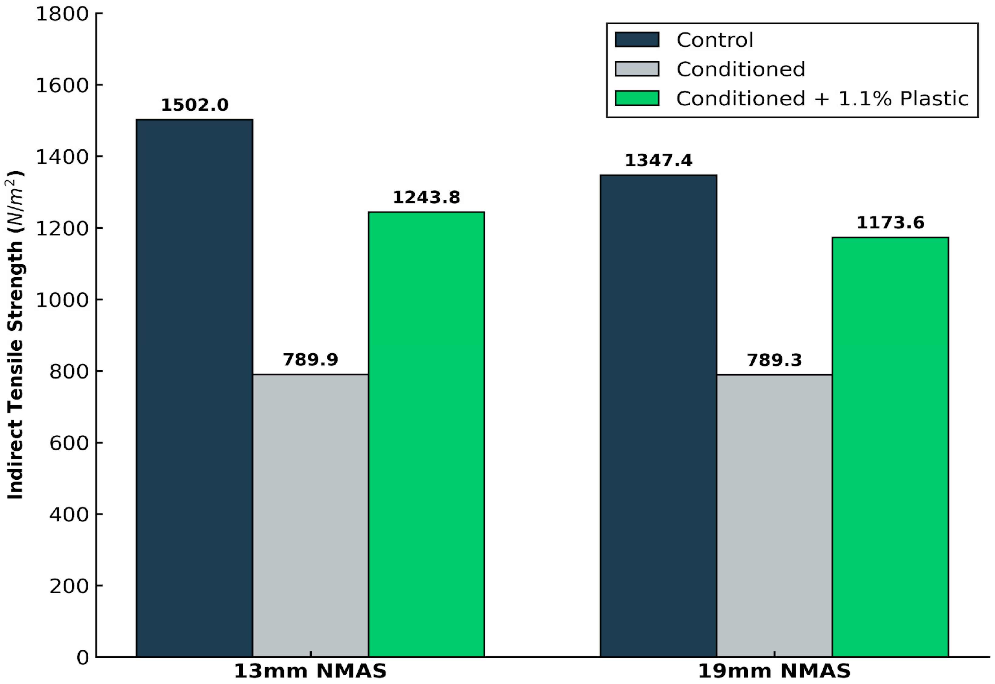 The 13 mm NMAS mixtures initially achieved higher tensile strength. This is attributed to the increased surface area of finer particles, which promotes denser packing and enhances internal mastic cohesion. Despite higher initial strength, the 13 mm gradation suffered a greater decline in performance when subjected to moisture conditioning. The finer matrix, while cohesive, possesses a higher total surface area that increases the exposure of hydrophilic mineral surfaces, specifically the alumina-rich clays and feldspars, to water ingress.