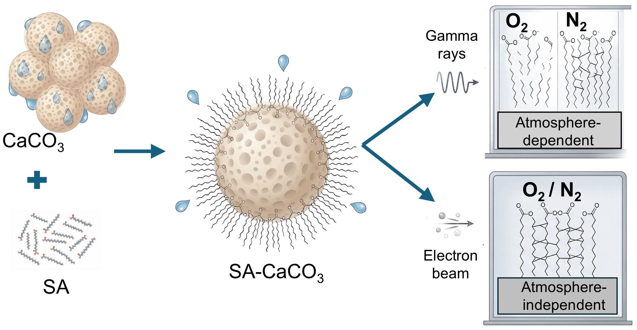To evaluate the role of oxygen on radiation-induced stabilization consistent with crosslinking of stearic acid (SA) adsorbed on CaCO3, gamma and e-beam irradiation were applied under oxygen-free and oxygen-rich conditions. The effects of ionizing radiation on both untreated CaCO3 particles and SA-modified CaCO3 were evaluated by analyzing structural stability, thermal behavior, optical properties, and surface wettability, thereby enabling assessment of CaCO3 stability and crosslinking efficiency of the surface-bound SA layer. Specifically, FTIR-ATR was used to assess structural stability of the CaCO3 substrate, TGA to evaluate thermal behavior, contact angle and surface energy measurements to probe surface modification, and colorimetric analysis to examine irradiation-induced optical changes.