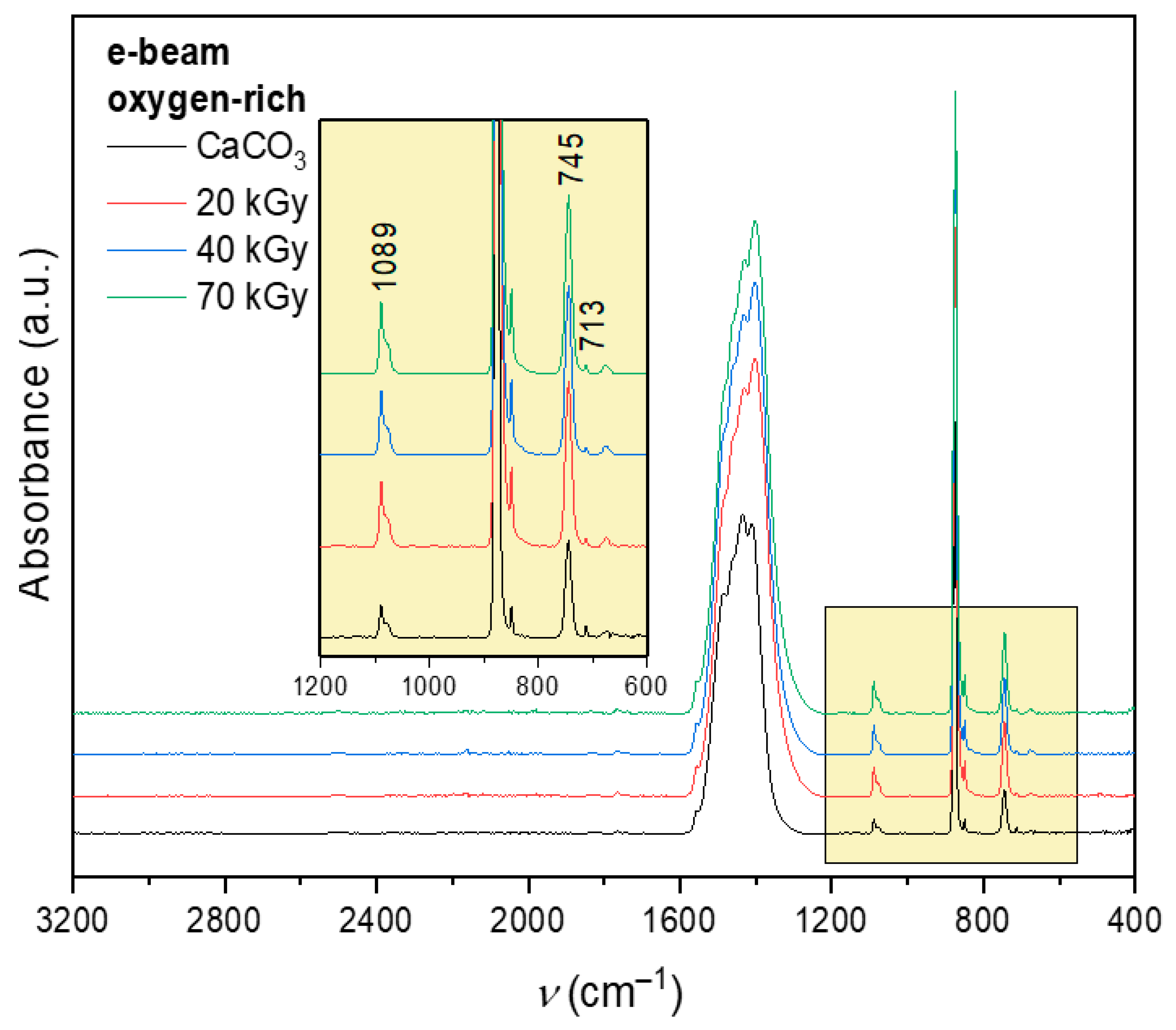 3.2.1. Structural Stability of CaCO3 Under Gamma and E-Beam Irradiation (FTIR)